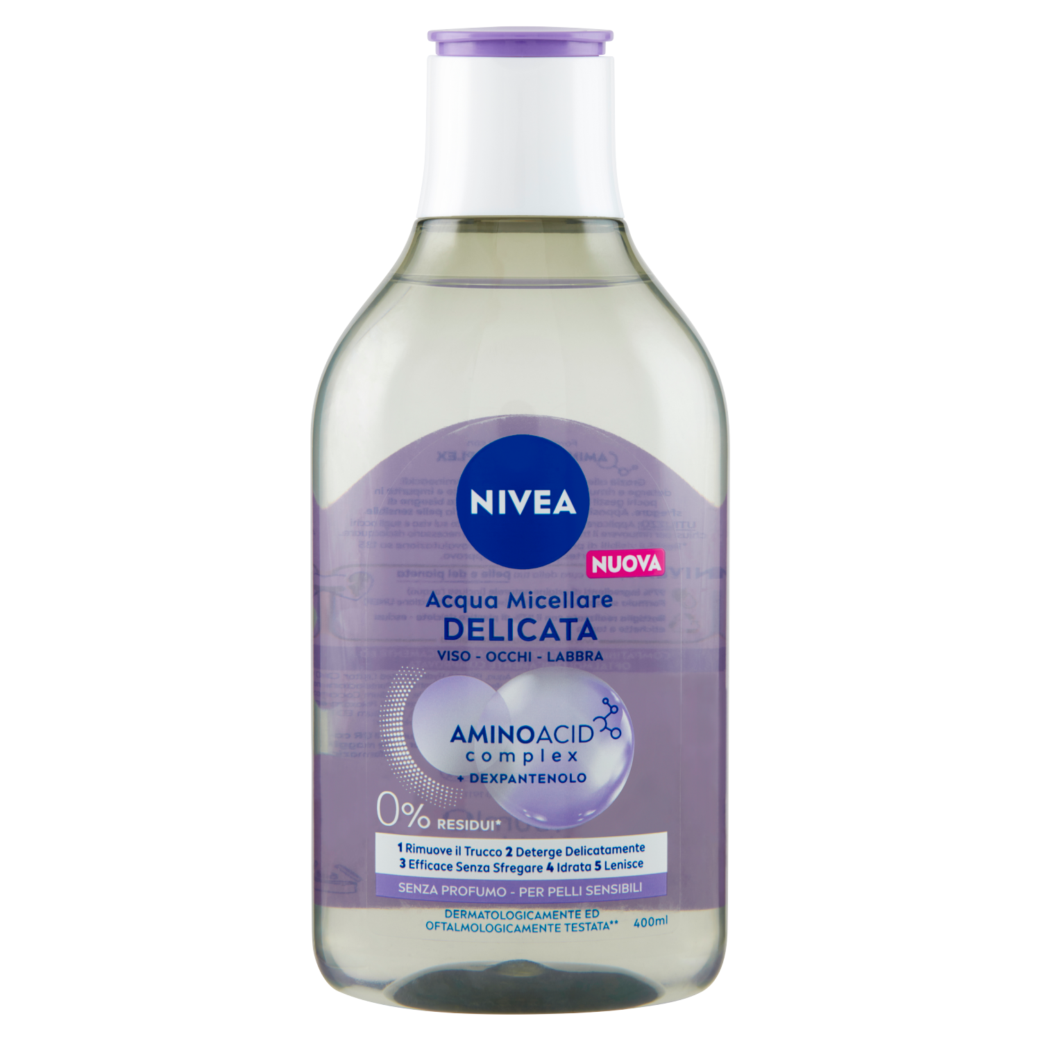 Formula Delicata con Amino Acid Complex + Dexpantenolo Grazie alle Micelle arricchite con Aminoacidi: deterge e rimuove fino al 100% di trucco e impurità in pochi gesti! Delicata sulla pelle, senza bisogno di sfregare. Appositamente sviluppata per la pelle sensibile. Nivea si prende cura della tua pelle e del pianeta - 97% ingredienti di origine naturale (inclusa l'acqua) Formula senza microplastiche (secondo la definizione UNEP) - Bottiglia realizzata con il 97% di plastica riciclata - esclusi etichette e tappo www.nivea.it/sostenibilita