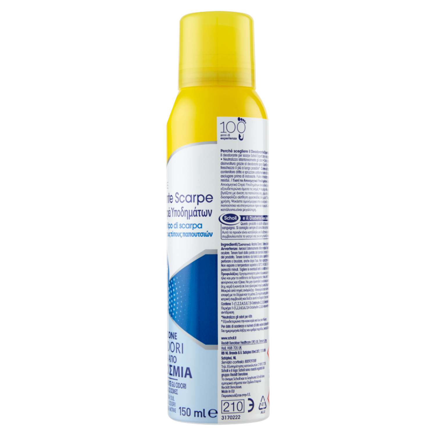 Come utilizzare il prodotto Agitare bene prima dell'uso. Tenere il contenitore dritto e spruzzare uniformemente all'interno della scarpa prima e/o dopo l'uso. Lasciare le scarpe ad asciugare prima di indossarle. Pulire immediatamente la superficie esterna se presenti tracce di prodotto. Senza residui. Scholl e il Diabete: Questo prodotto è adatto all'uso nella scarpa se soffre di diabete o di scarsa circolazione sanguigna. Se consiglia sempre di consultare un medico o un podologo in caso di dubbi sulla cura del piede