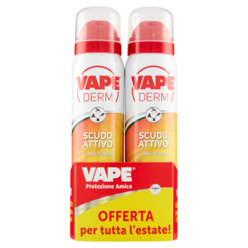 Vape Spray Antipuntura è uno spray insetto repellente secco in grado di proteggere efficacemente la pelle di adulti e bambini da diversi insetti volanti quali zanzare comuni (Culex Pipiens), tigre (Aedes Albopictus) e Anofele (Anopheles Gambiae) queste ultime responsabili della trasmissione della malaria. Vape Spray Antipuntura protegge anche dalle zecche (Ixodes Ricinus) e dai Tafani (Chrysops Relictus), mantenendo la pelle asciutta e profumata. La speciale formulazione non unge e crea una barriera di protezione contro gli insetti. Protetti più a lungo, anche quando si suda.