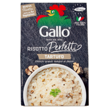 Facile da preparare 1. Versa 175 g di Risotto (= 1 busta) + 450 ml d'acqua. Oppure versa 2 bicchieri di acqua fredda per 1 bicchiere di Risotto. Mescola e porta a bollore. 2. Da quando l'acqua bolle cuoci per circa 12 min. mescolando di tanto in tanto. 3. Prima che il liquido si sia assorbito completamente, spegni il fornello e aggiungi un filo d'olio o una noce di burro. Parmigiano a piacere. Personalizza il tuo Risotto Perfetto Tartufo Completa con: - Patate a cubetti saltate - Una dadolata di porcini freschi saltati nell'olio d'oliva