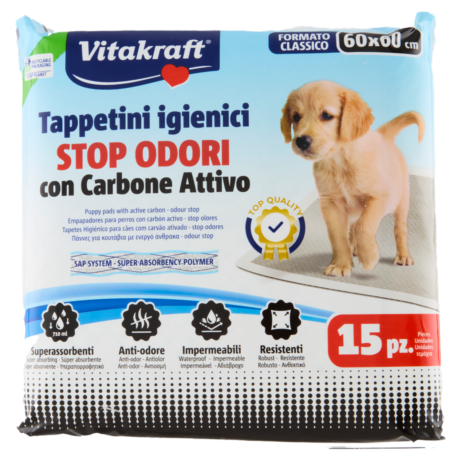 SAP System Super Absor-bency Polymer, il nuovo sistema ad alto potere assorbente, in poco tempo, grazie ai polimeri, trattiene una elevata quantità di liquidi. Elimina i cattivi odori La speciale combinazione con carbone attivo garantisce un aria più sana, vengono eliminati i cattivi odori e viene ridotta la loro formazione in modo naturale. Il tappetino Vitakraft è un traversino multistrato super assorbente e pratico, che aiuta a risolvere i problemi igienici dei vostri piccoli amici. Lo strato superiore assorbe l'umidità, mentre quello inferiore, completamente impermeabile, la trattiene evitando così di bagnare la superficie sottostante. Stendere il tappetino sulla vaschetta toilette o sul pavimento al fine di educare il vostro cucciolo a riconoscere i luoghi adatti all'espletamento delle necessità fisiologiche. Può altresì essere usato per necessità post-operatorie e per qualsiasi altro tipo di protezione igienica.