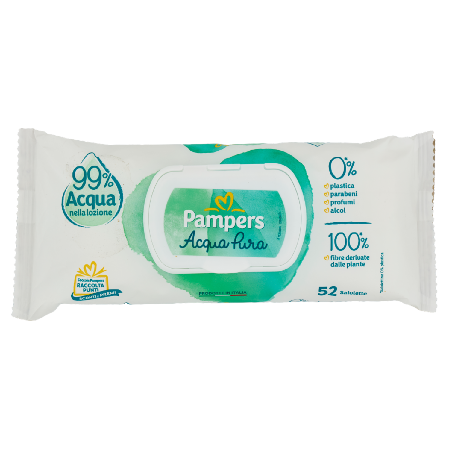 Da oggi le salviettine Acqua Pura sono senza plastica, fatte con il 100% di fibre derivate dalle piante. Confezione in plastica riciclabile Pampers - Con amore si cambia scopri di più su www.pampers.it/sostenibilità