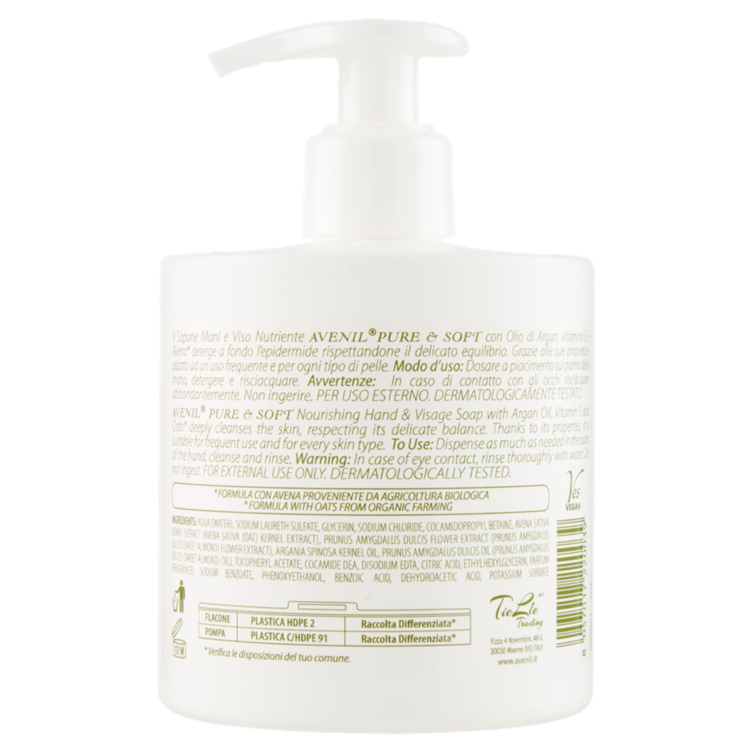 Il Sapone Mani e Viso Nutriente Avenil Pure & Soft con Olio di Argan, Vitamina E e Avena* deterge a fondo l'epidermide rispettandone il delicato equilibrio. Grazie alle sue proprietà è adatto ad un uso frequente e per ogni tipo di pelle. * Formula con avena proveniente da agricoltura biologica Dermatologicamente testato.
