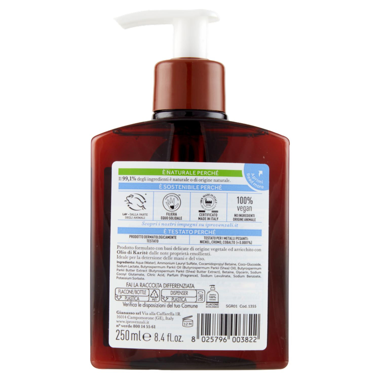 È naturale perché Il 99,1% degli ingredienti è naturale o di origine naturale. È testato perché Prodotto dermatologicamente testato Testato per i metalli pesanti: nichel, cromo, cobalto (< 0.0001%) Prodotto formulato con basi delicate di origine vegetale ed arricchito con Olio di Karité dalle note proprietà emollienti. Ideale per la detersione delle mani e del viso.