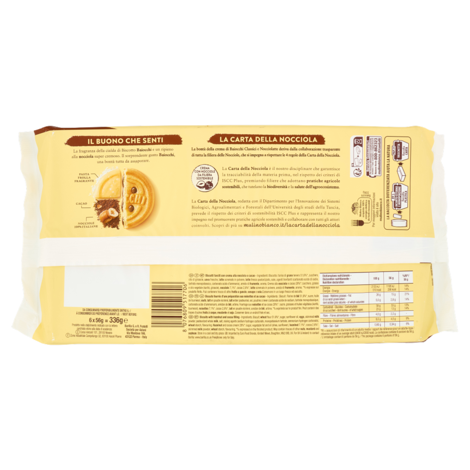 Tutto il buono che senti Da oggi l'esperienza di Baiocchi si arricchisce: ancora più crema dal gusto inconfondibile di nocciole 100% italiane unite al cacao in una morbida e golosa farcitura. Pasta frolla fragrante Cacao Nocciole 100% italiane Con ancora più Crema! Il buono che non vedi - Per la nostra produzione acquistiamo 100% energia elettrica proveniente da fonti rinnovabili. - Tutti i nostri biscotti sono senza grassi idrogenati e senza coloranti. mulinobianco.it