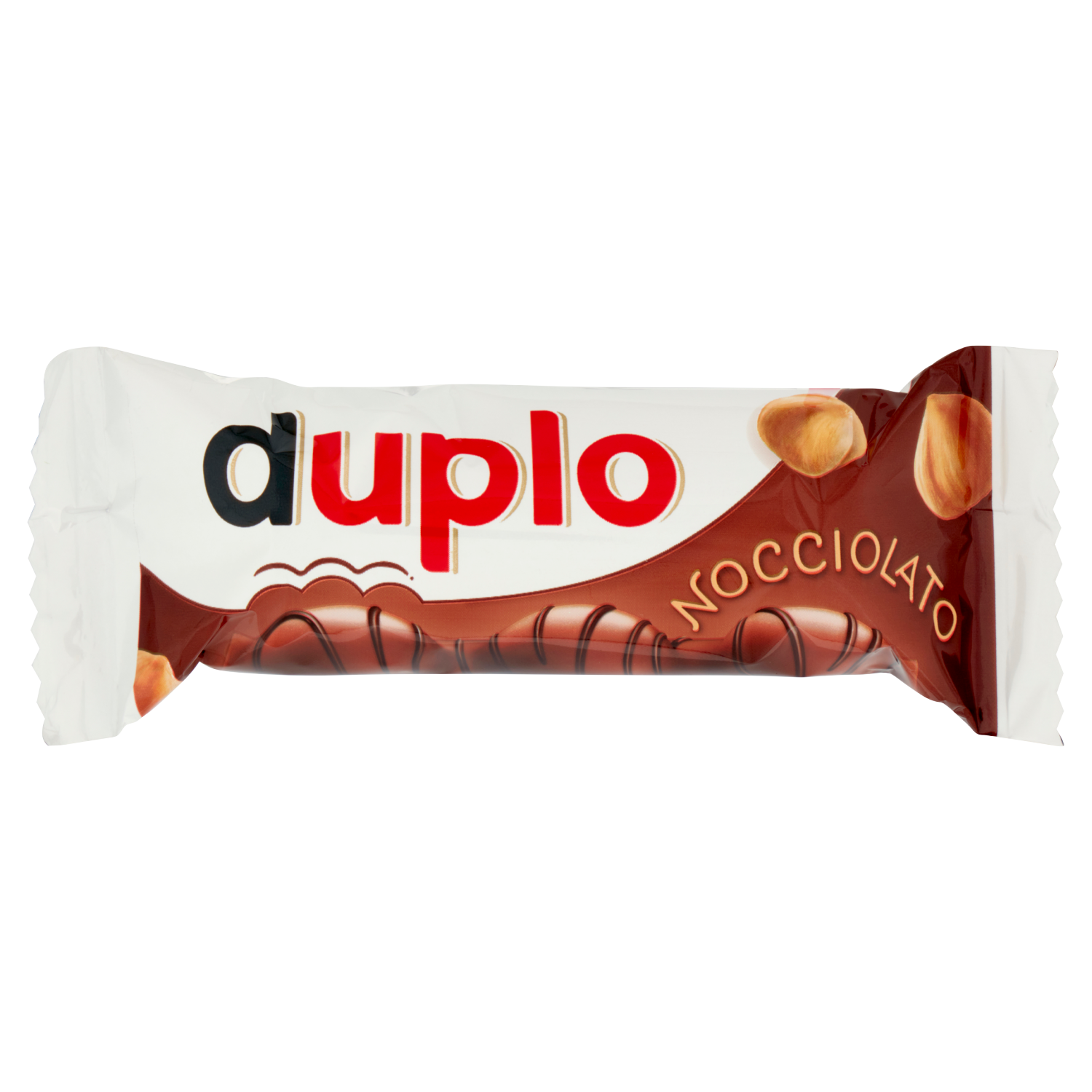 Wafer ricoperto di cioccolato al latte con decoro di cioccolato extra, con nocciole intere e morbido ripieno alla nocciola e al cacao