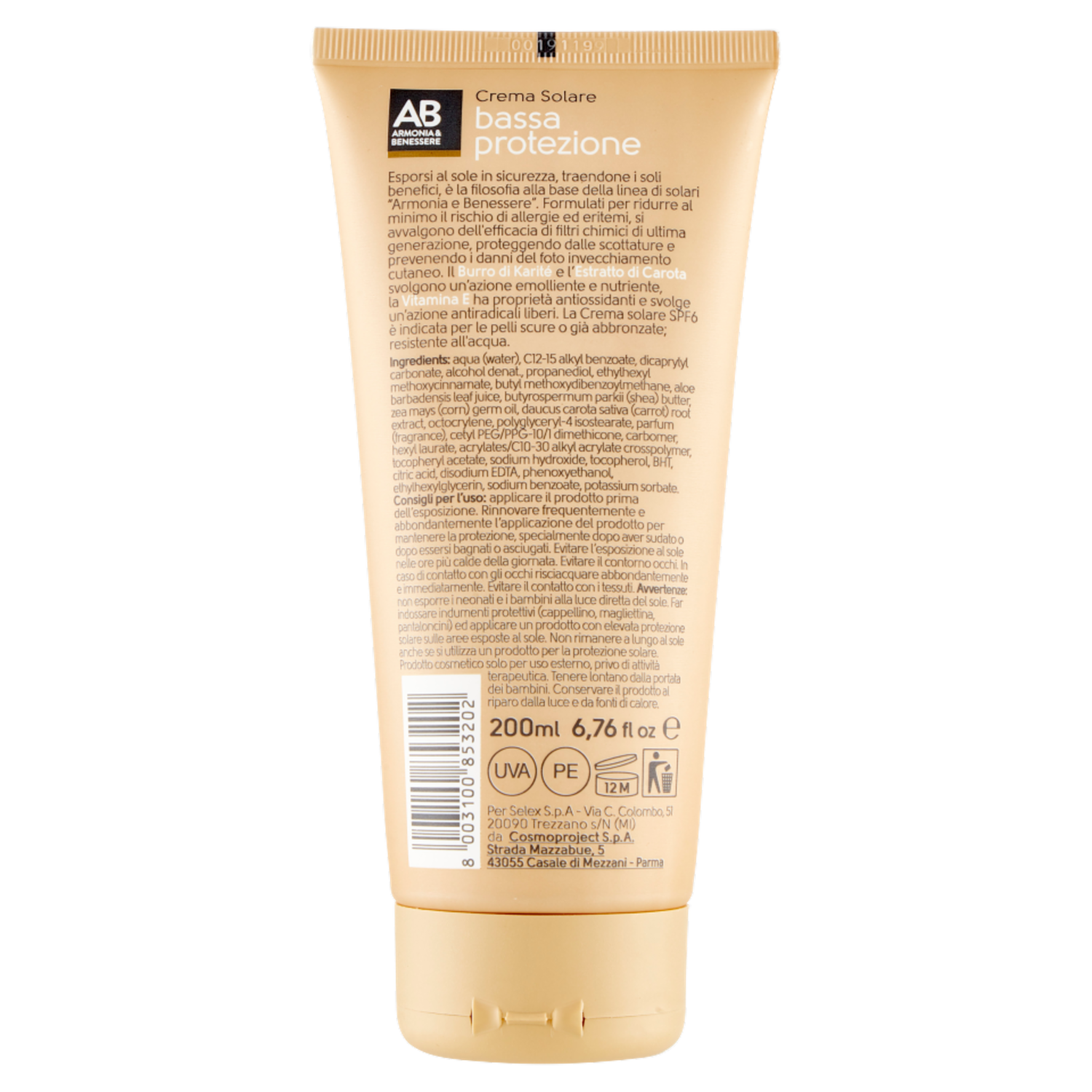 Esporsi al sole in sicurezza, traendone i soli benefici, è la filosofia alla base della linea di solari ''Armonia e Benessere''. Formulati per ridurre al minimo il rischio di allergie ed eritemi, si avvalgono dell'efficacia di filtri chimici di ultima generazione, proteggendo dalle scottature e prevenendo i danni del foto invecchiamento cutaneo. Il Burro di Karité e l'Estratto di Carota svolgono un'azione emolliente e nutriente, la Vitamina E ha proprietà antiossidanti e svolge un'azione antiradicali liberi. La Crema solare SPF6 è indicata per le pelli scure o già abbronzate; resistente all'acqua.