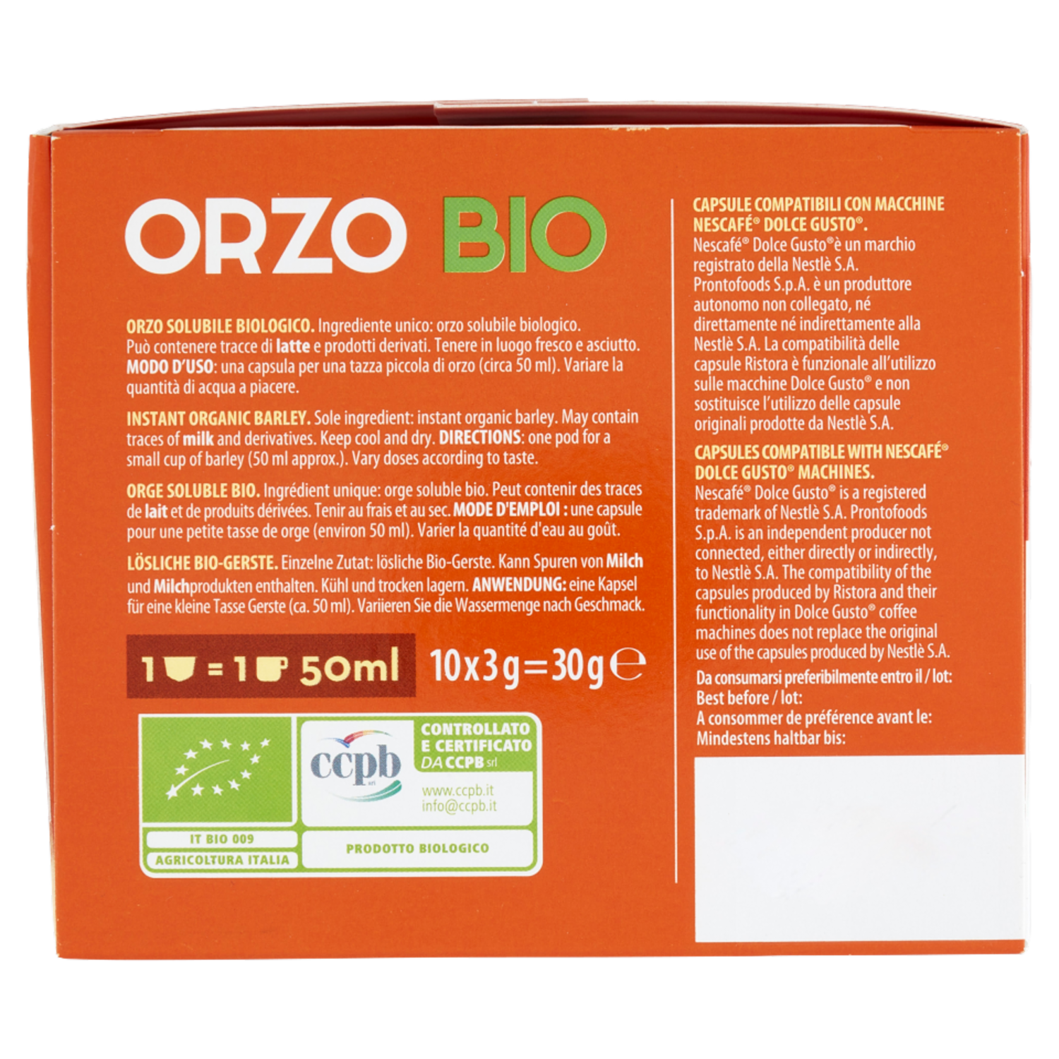 Capsule compatibili con macchine Nescafé Dolce Gusto. Nescafé Dolce Gusto è un marchio registrato della Nestlè S.A. Prontofoods S.p.A. è un produttore autonomo non collegato, né direttamente né indirettamente alla Nestlè S.A. La compatibilità delle capsule Ristora è funzionale all'utilizzo sulle macchine Dolce Gusto e non sostituisce l'utilizzo delle capsule originali prodotte da Nestlè S.A. 100% orzo biologico Italiano naturalmente privo di caffeina. Assaporalo nelle pratiche capsule Ristora compatibili con le macchine Nescafè Dolce Gusto.