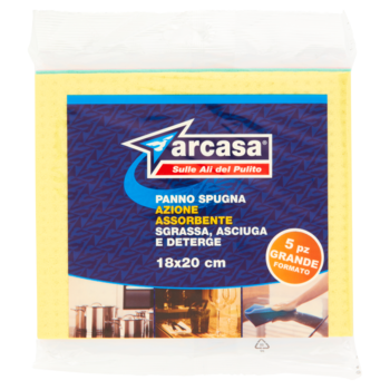 Panno spugna ad azione assorbente. Sgrassa, asciuga e deterge. Assorbe di più e dura a lungo.