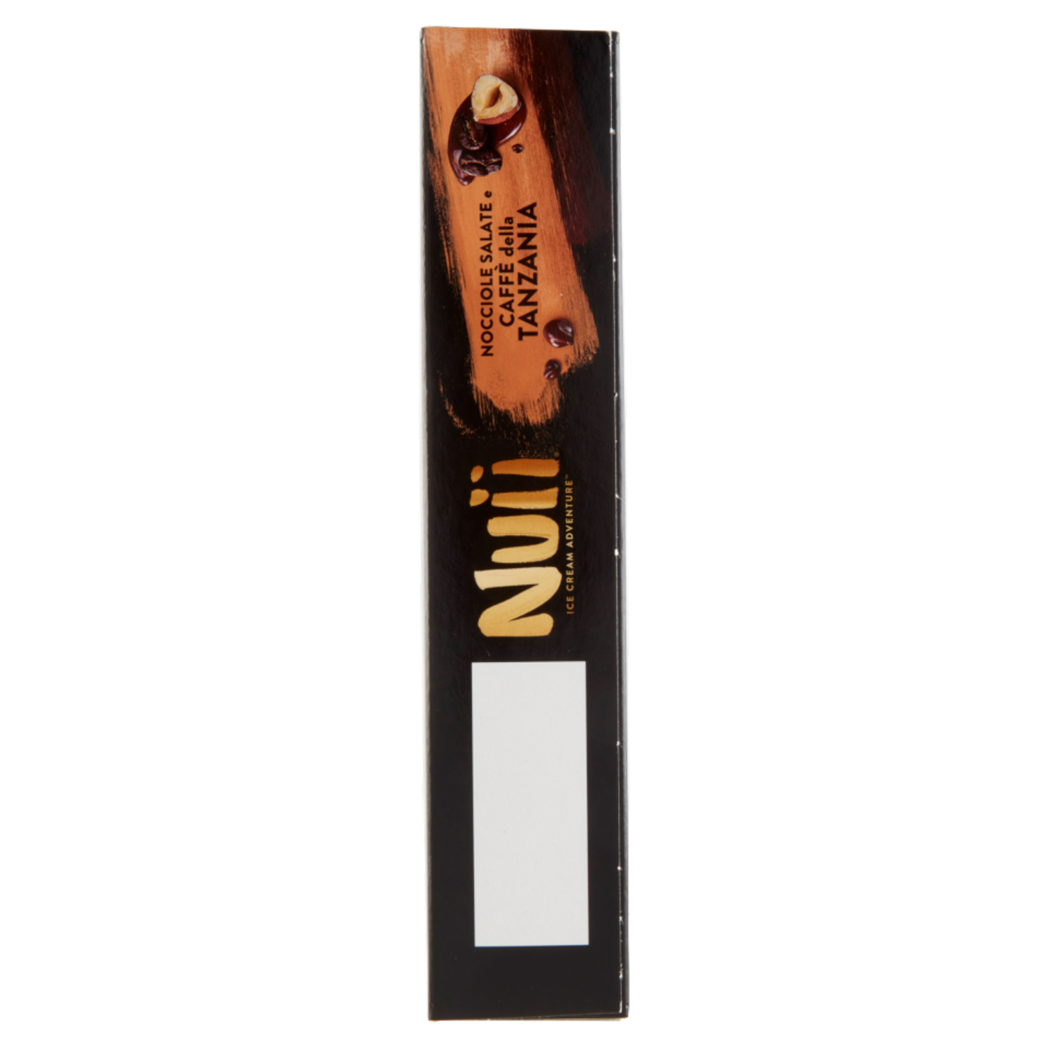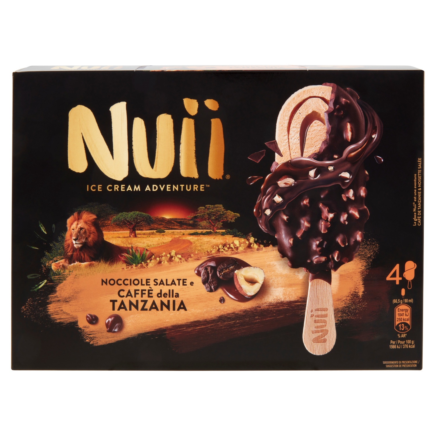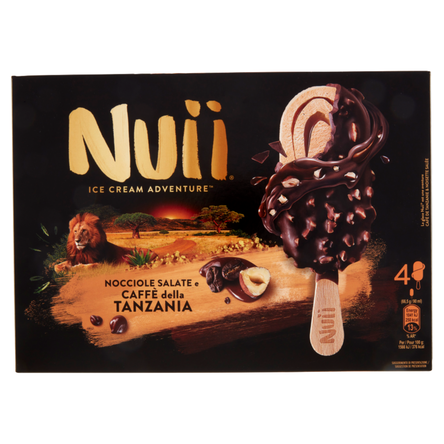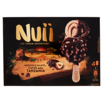 Gelato al caffè della Tanzania con caffè della Tanzania in polvere (0,4 %) e con variegatura al cioccolato (5 %), ricoperto di cioccolato fondente (32 %) con granella di nocciole salate (4,5 %)