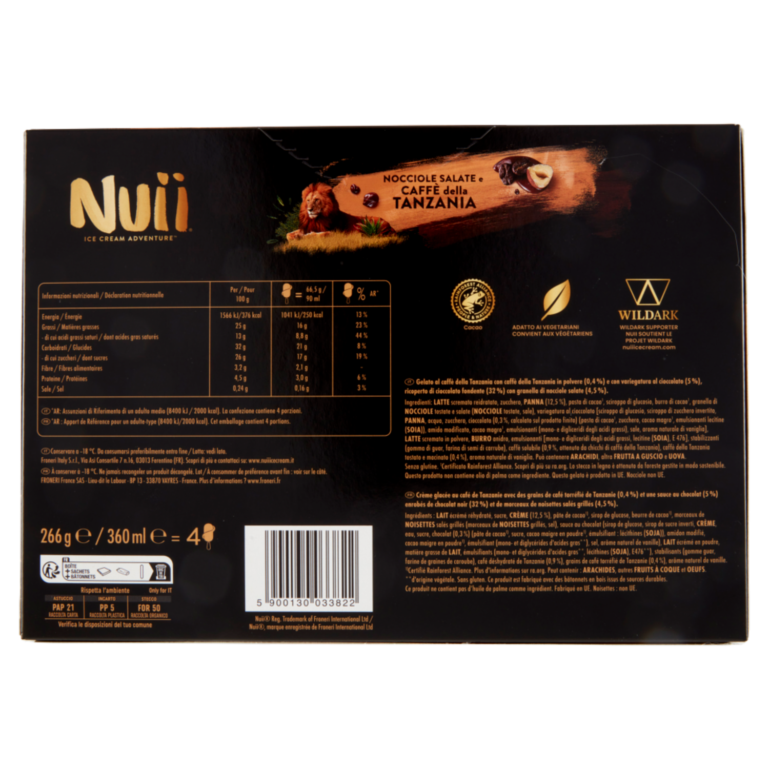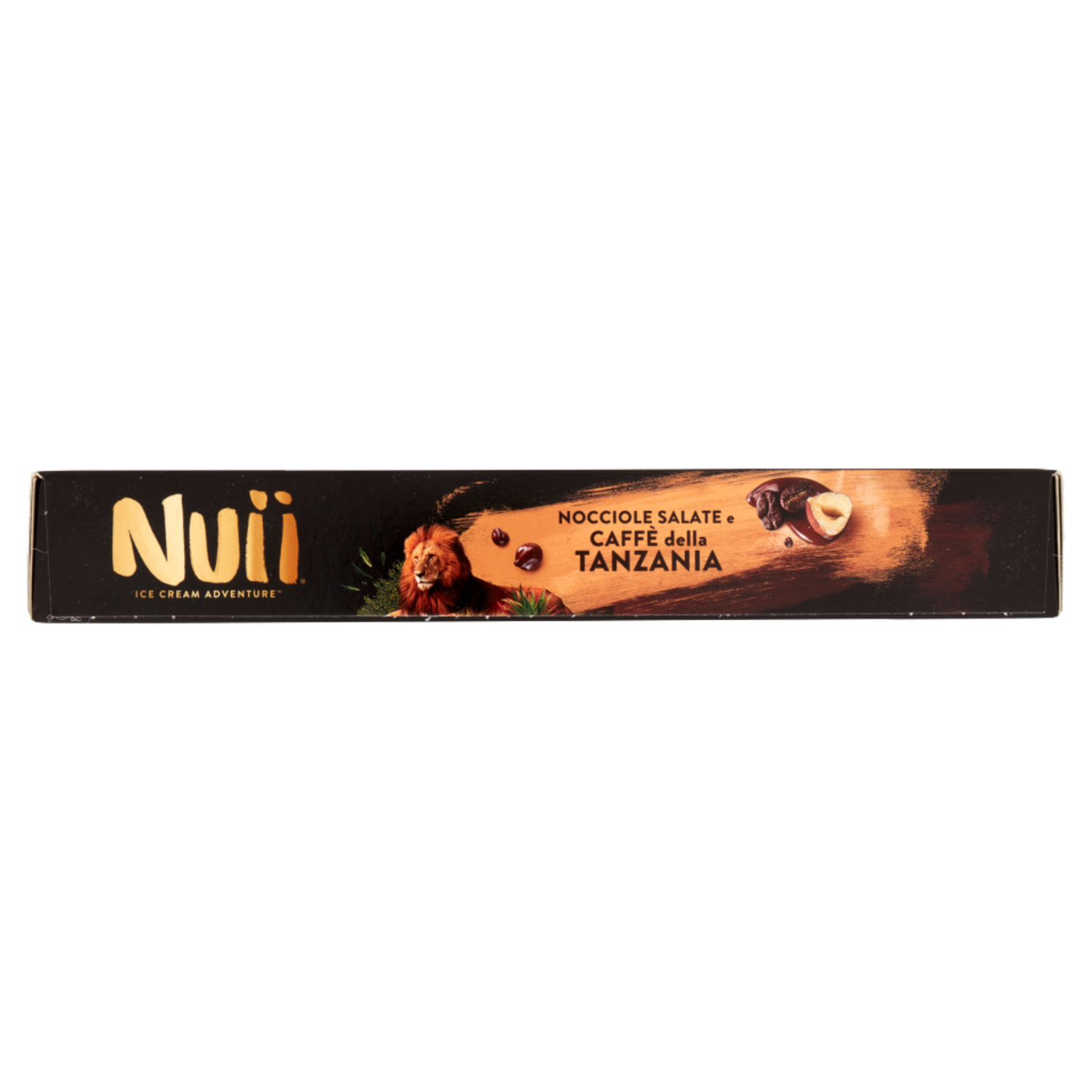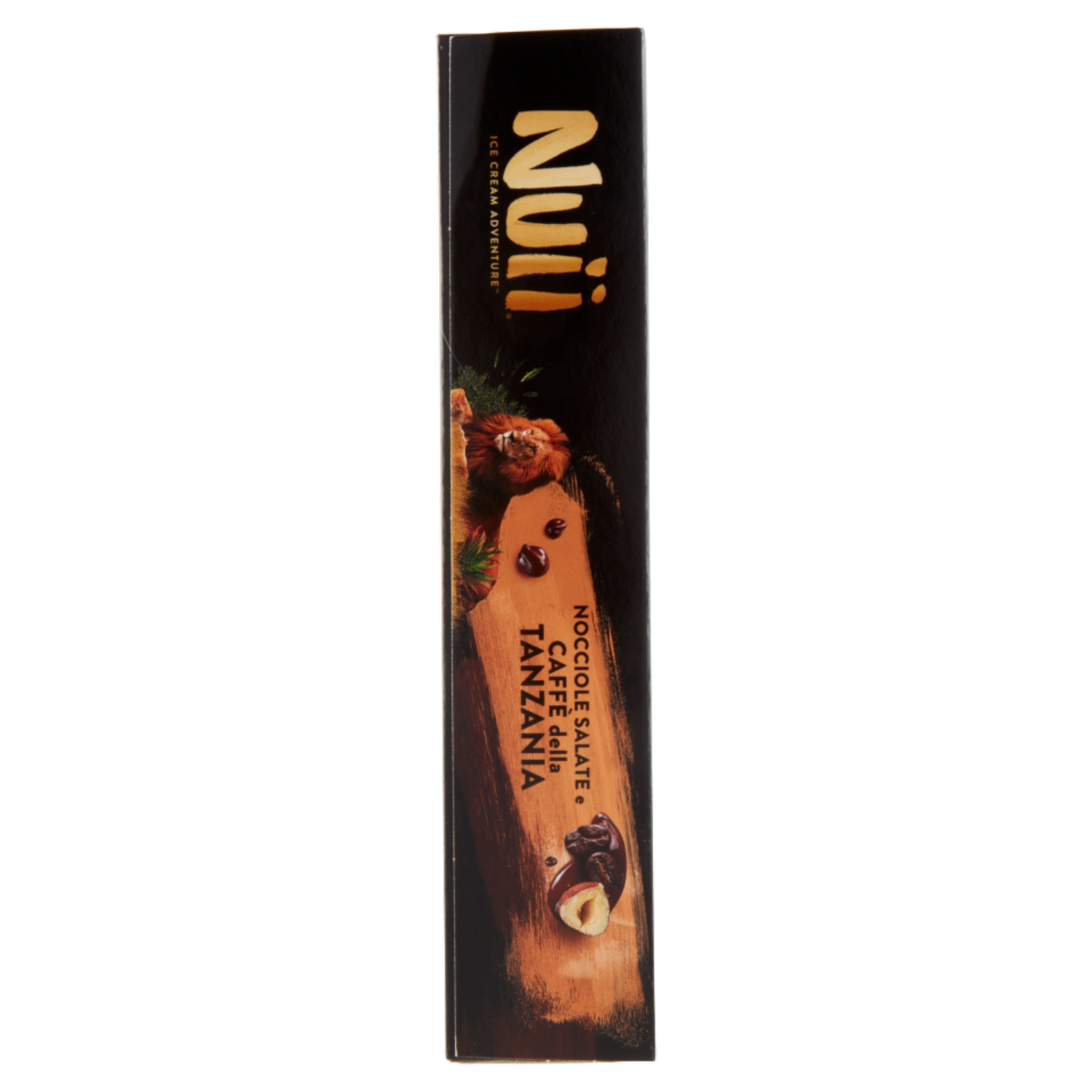 Gelato al caffè della Tanzania con caffè della Tanzania in polvere (0,4 %) e con variegatura al cioccolato (5 %), ricoperto di cioccolato fondente (32 %) con granella di nocciole salate (4,5 %)