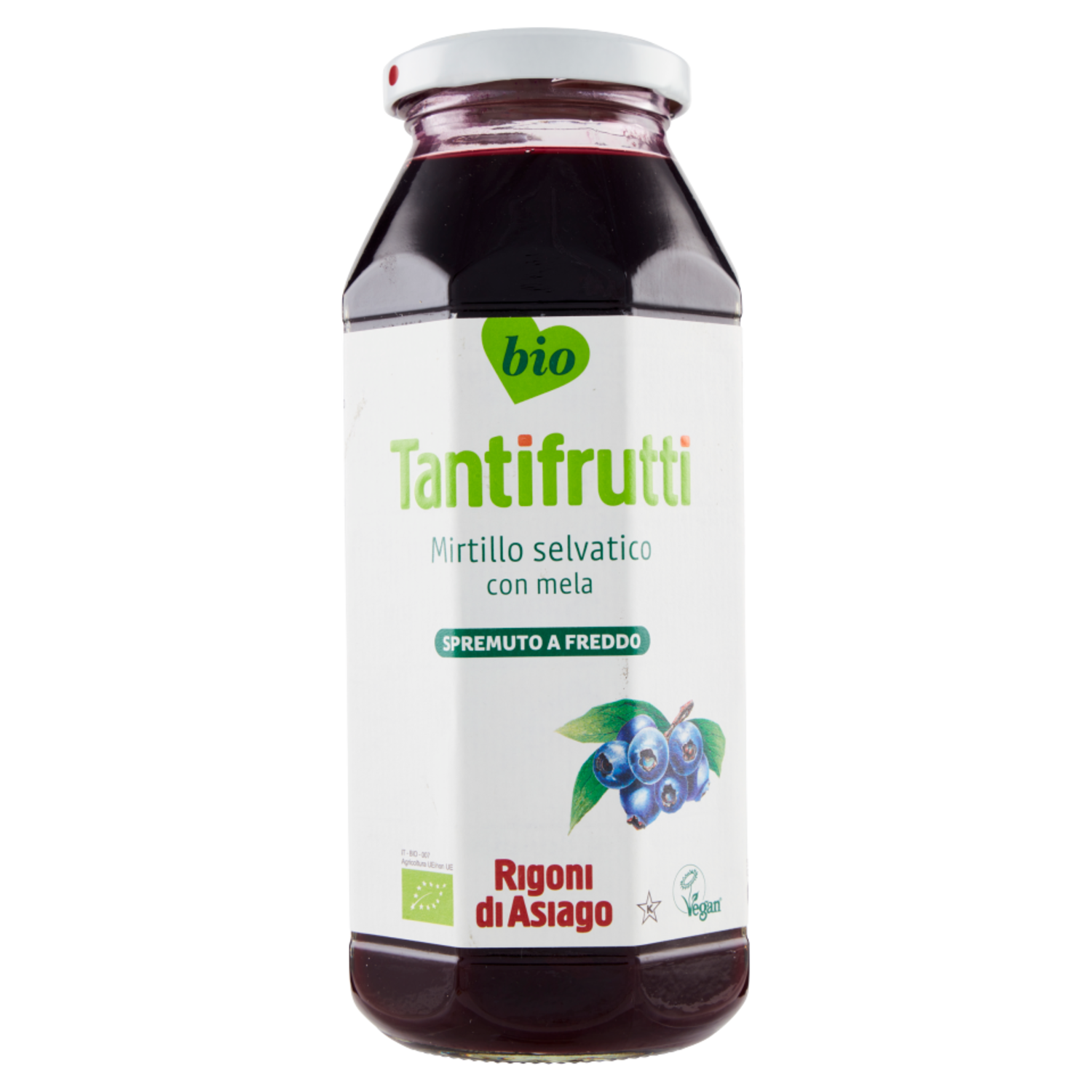 Nettare biologico con succo di mirtilli selvatici spremuti a freddo e succo di mela. La dolcezza delle mele e oltre 1000 mirtilli per una pausa naturale e dissetante.