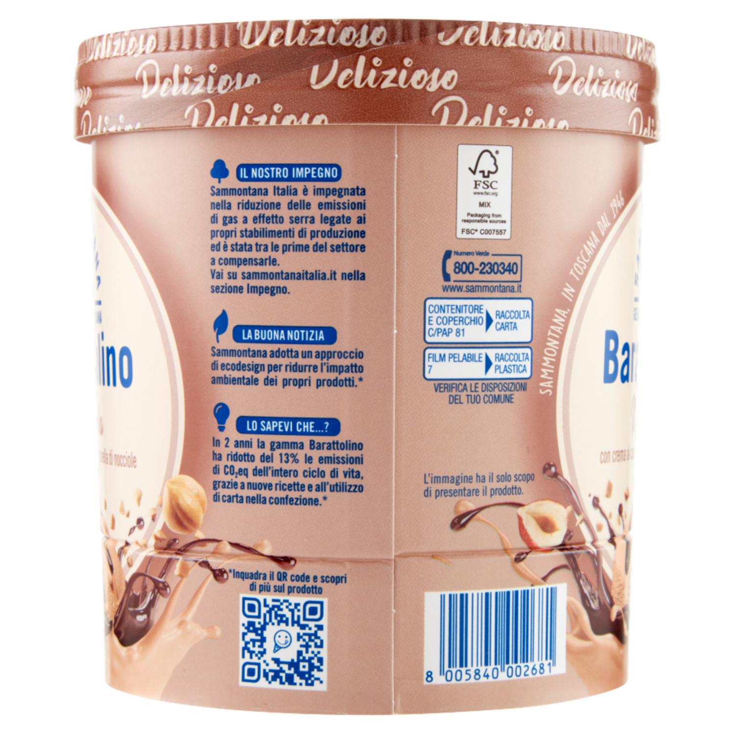 Sammontana Gelati all'italiana Sammontana, in Toscana dal 1946 Il nostro impegno Sammontana Italia è impegnata nella riduzione delle emissioni di gas a effetto serra legate ai propri stabilimenti di produzione ed è stata tra le prime del settore a compensarle. Vai su sammontanaitalia.it nella sezione Impegno. La buona notizia Sammontana adotta un approccio di ecodesign per ridurre l'impatto ambientale dei propri prodotti.* Lo sapevi che...? In 2 anni la gamma Barattolino ha ridotto del 13% le emissioni di CO₂eq dell'intero ciclo di vita, grazie a nuove ricette e all'utilizzo di carta nella confezione.* *Inquadra il QR code e scopri di più sul prodotto