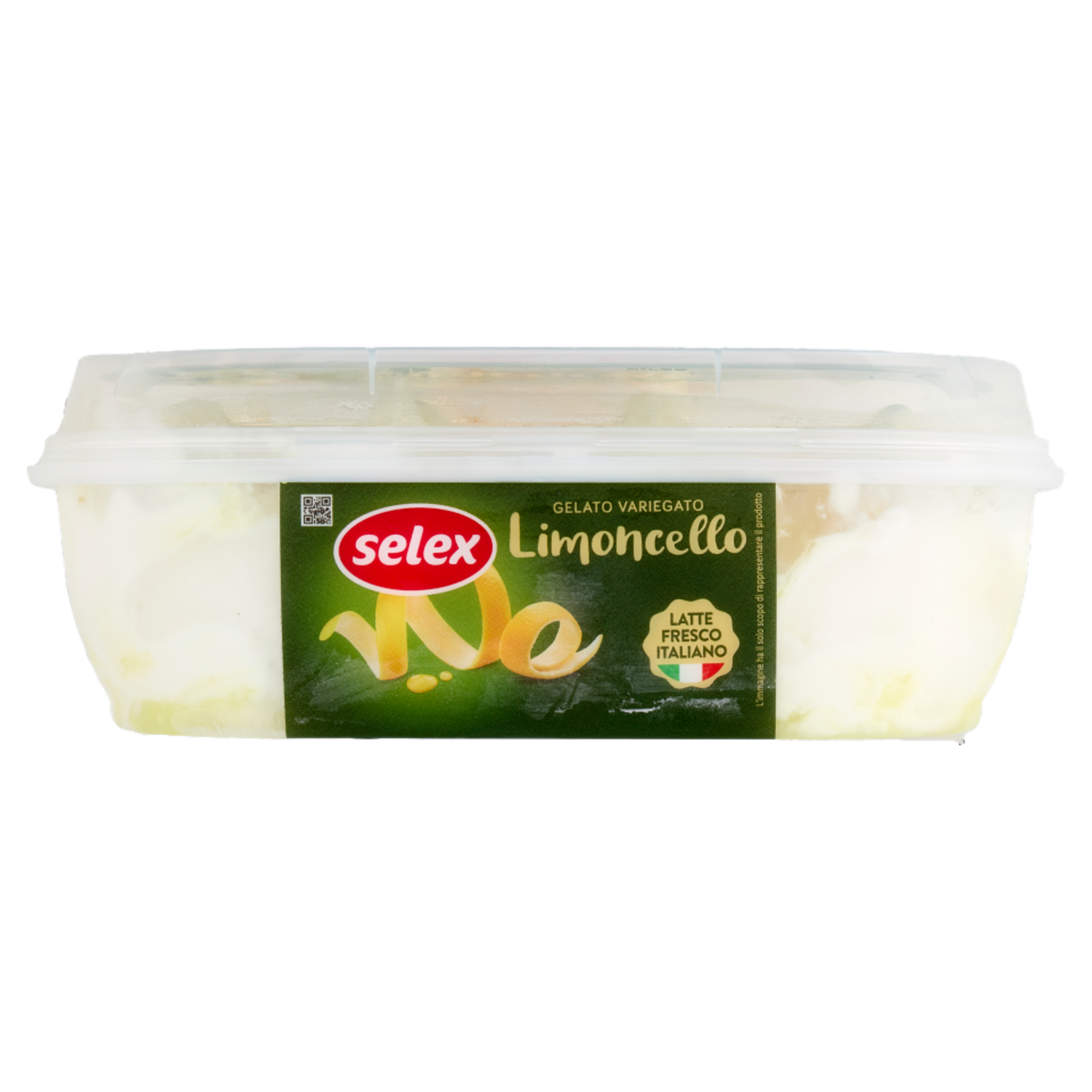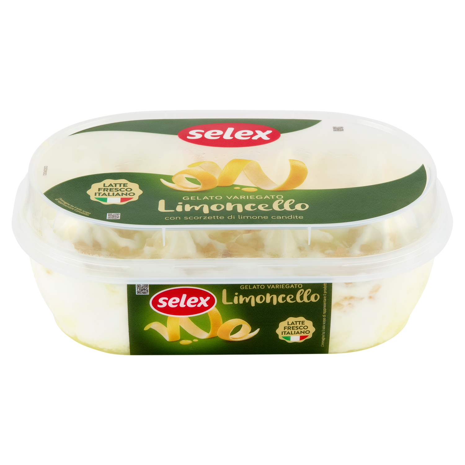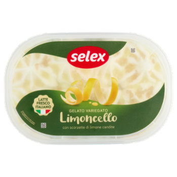 Gelato al limone con latte fresco variegato al gusto di limoncello 21,6% e decorato con scorzette di limone candite 2,7%