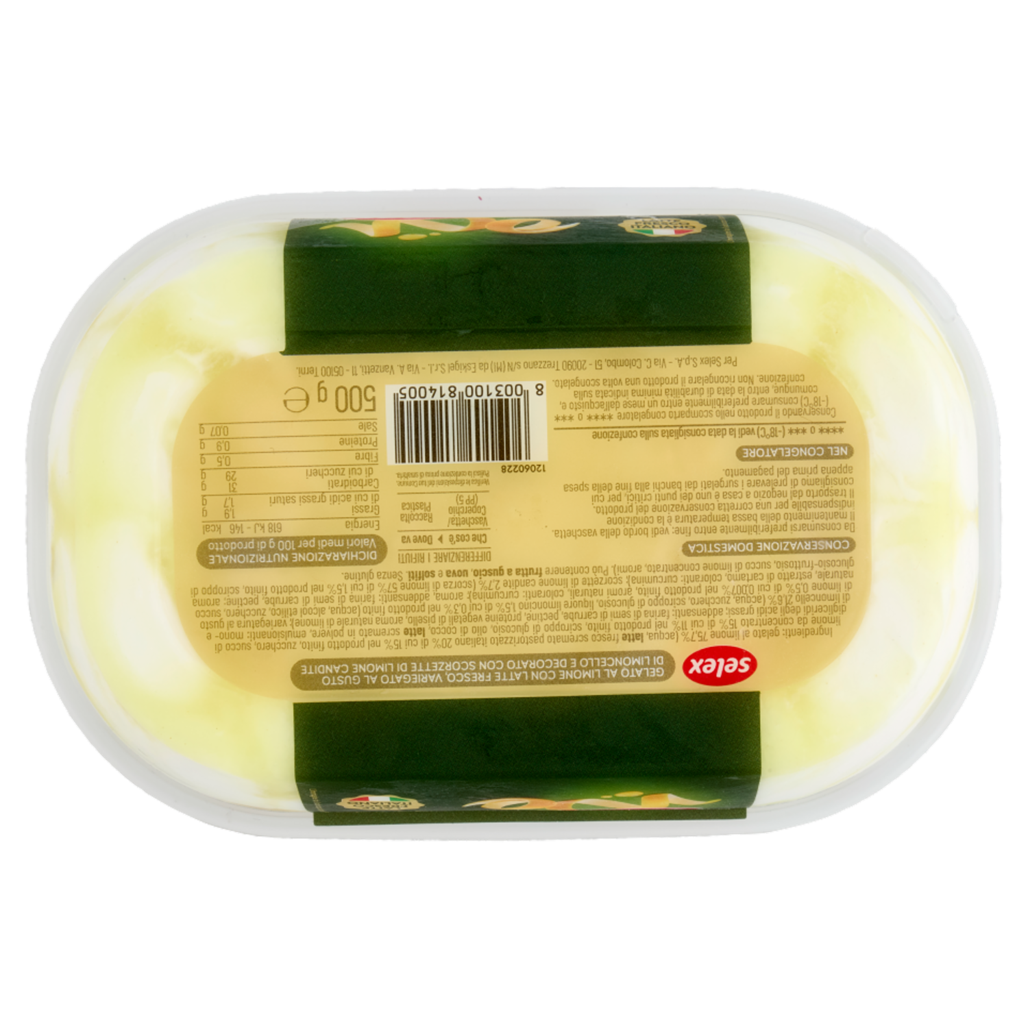 Gelato al limone 75,7% (acqua, latte fresco scremato pastorizzato italiano 20% di cui 15,1% nel prodotto finito, zucchero, succo di limone da concentrato 15% di cui 11,3% nel prodotto finito, sciroppo di glucosio, olio di cocco, proteine vegetali (proteine del pisello idrolizzate, zucchero), latte scremato in polvere, emulsionanti: mono- e digliceridi degli acidi grassi; aromi naturali, addensanti: farina di semi di carrube, pectina)