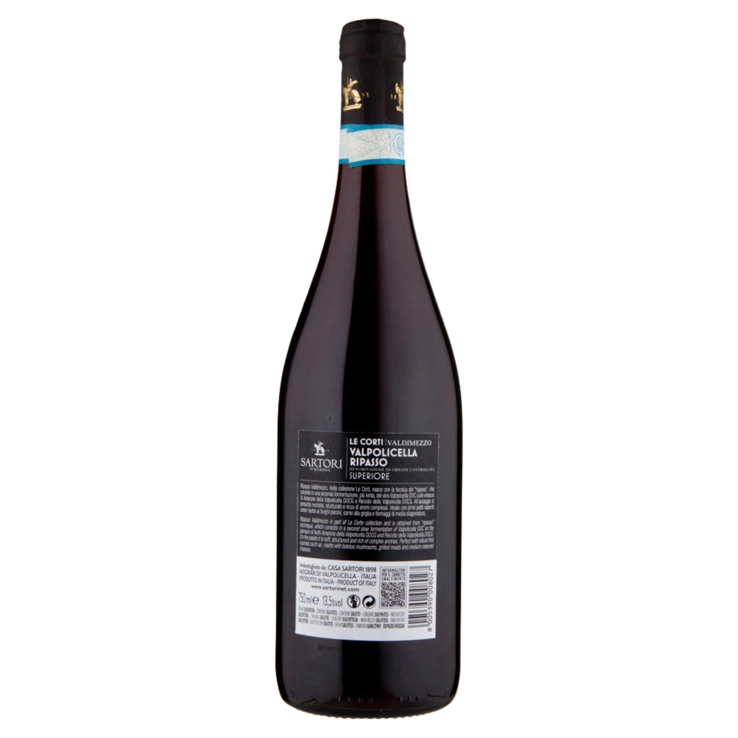 Valpolicella Ripasso DOC Superiore Valdimezzo, vino rosso italiano. Ripasso Valdimezzo, della collezione Le Corti, nasce con la tecnica del "ripasso", che consiste in una seconda fermentazione, più lenta, del vino Valpolicella DOC sulle vinacce di Amarone della Valpolicella DOCG e Recioto della Valpolicella DOCG. All'assaggio si presenta morbido, strutturato e ricco di aromi complessi. Valpolicella Ripasso Denominazione di Origine Controllata