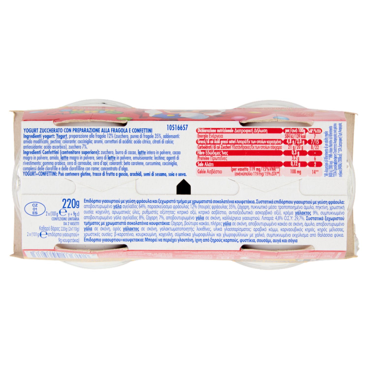 Ingredienti yogurt: yogurt, preparazione alla fragola 12% (zucchero, purea di fragole 35%, addensanti: amido di mais modificato, pectina; colorante: cocciniglia; aromi, correttori di acidità: acido citrico, calcio citrato; antiossidanti: acido ascorbico), zucchero 7%