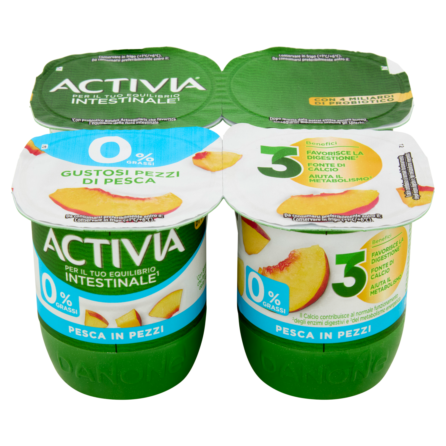 Activia contiene 4 miliardi di probiotico bifidus che favoriscono l'equilibrio della flora intestinale. 4 miliardi di probiotico bifidus equilibrio flora intestinale