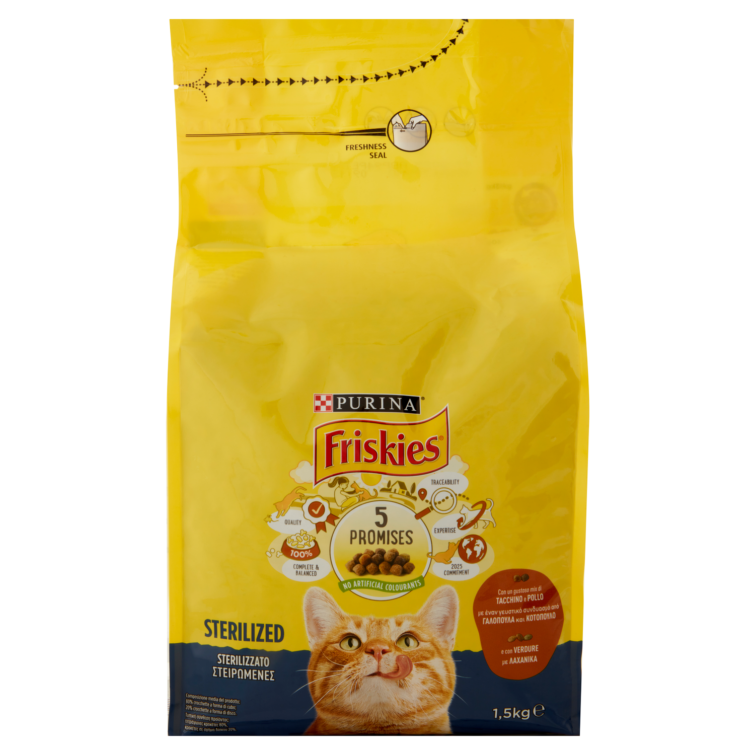 No coloranti, aromatizzanti o conservanti artificiali FRISKIES Sterilizzati è una ricetta appositamente formulata per fornire al tuo gatto sterilizzato tutti i nutrienti di cui ha bisogno per mantenerlo sano e felice. - Aiuta il tuo gatto a mantenere il peso ideale grazie al rapporto bilanciato tra proteine e grassi - Supporta un tratto urinario sano poichè contiene il giusto equilibrio di minerali - Un cuore sano e una buona vista grazie alla Taurina - Aiuta a supportare le sue difese naturali Per una maggiore varietà, per gatti cuccioli o anziani, per gatti che vivono in casa o corrono all'aperto, Friskies ha un prodotto per tutti: Junior, Sterile, Indoor, Hairball, Senior, Crunchy & Tender, Friskies Pouches - 5 Promises: - 100% Complete & balanced - Quality - Traceability - Expertise - 2025 Commitment - No artificial colourants - Con un gustoso mix di Tacchino e Pollo e con Verdure