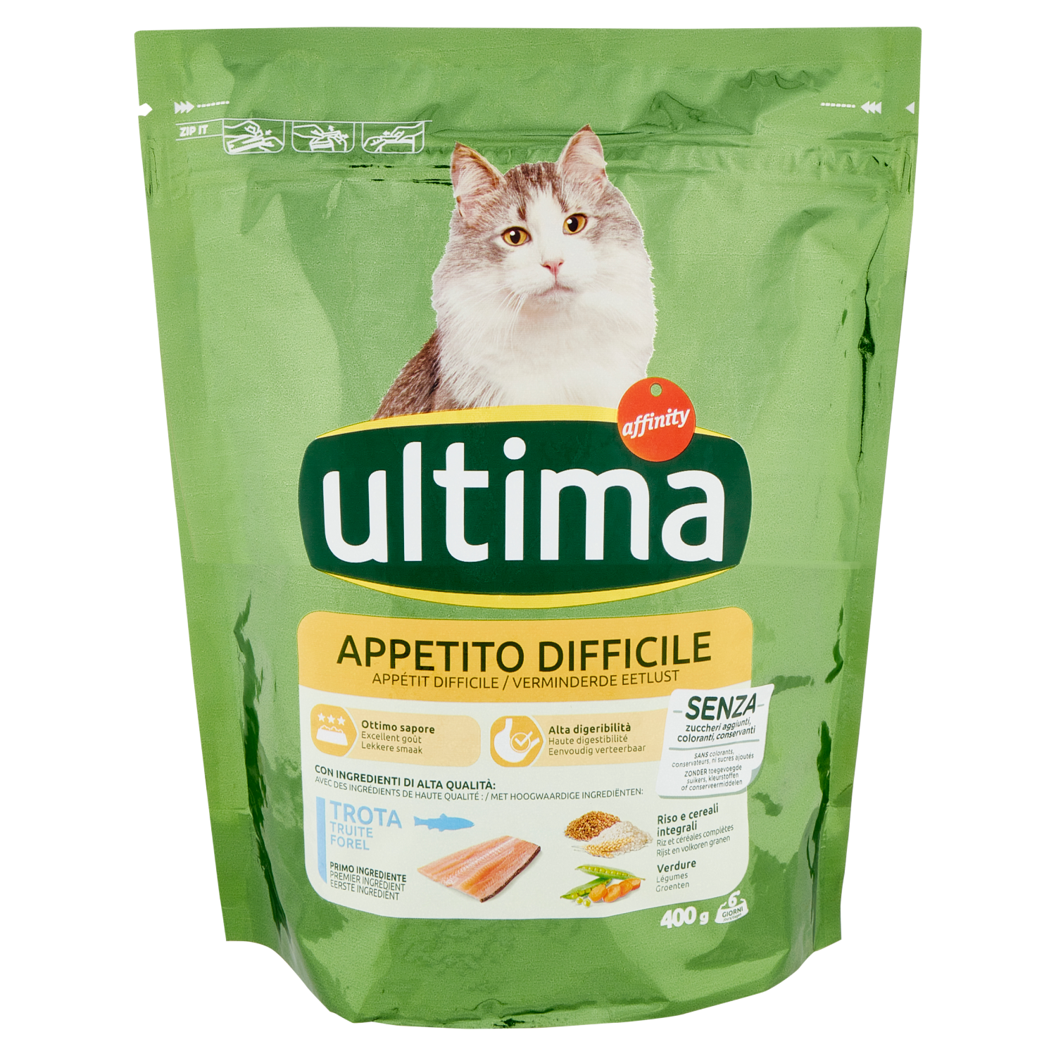 Con ingredienti di alta qualità: Trota - Primo ingrediente Riso e cereali integrali Verdure Una buona salute inizia da una buona alimentazione Appetito Difficile - Ottimo sapore Selezione di ingredienti altamente appetibili - Alta digeribilità Con trota e ingredienti attentamente selezionati per facilitare la digestione - Pelo lucido e benessere della pelle Acidi grassi omega-3 e omega-6, biotina e zinco - Forma fisica ideale Alto livello di proteine di qualità - Contribuisce a mantenere barriere e difese naturali Grazie a omega 6, biotina, zinco e ai livelli di vitamine C, D ed E