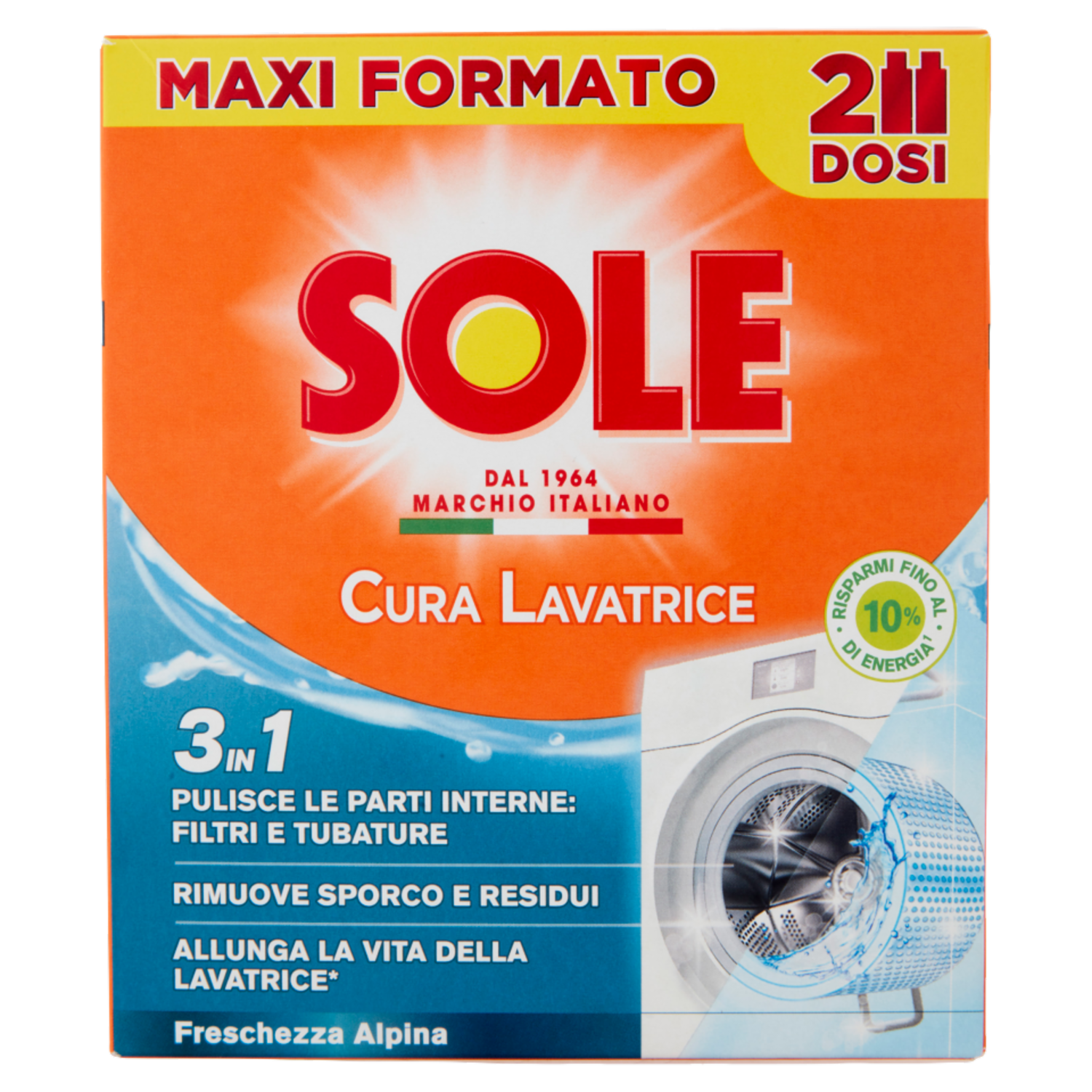 N°1 nel mercato² Un bucato fresco e profumato inizia da una lavatrice pulita. Sole Cura Lavatrice pulisce e rimuove residui di sporco e detersivo dalle superfici interne della tua lavatrice lasciando un piacevole profumo, migliorandone le prestazioni. Per un mondo più pulito Risparmi fino al 10% di energia 90% Ingredienti di origine naturale 98% Formula biodegradabile³ Pulisce le parti interne: filtri e tubature Rimuove sporco e residui Allunga la vita della lavatrice* Risparmi fino al 10% di energia Efficacia testata Extra freschezza Un lavaggio con resistenza coperta da calcare richiede più tempo ed energia per riscaldare l'acqua rispetto ad una resistenza pulita. Usa Sole Cura Lavatrice per ottimizzare il consumo di energia della tua lavatrice. ²Fonte: NielsenIQ, Market Track Data, Totale Italia, Mercato Cura Lavatrice, Anno 2022 ³Formula a base acquosa col 98% dei composti organici prontamente biodegradabili *Basato sul fatto che una resistenza coperta da calcare può rompersi più facilmente rispetto ad una resistenza pulita.