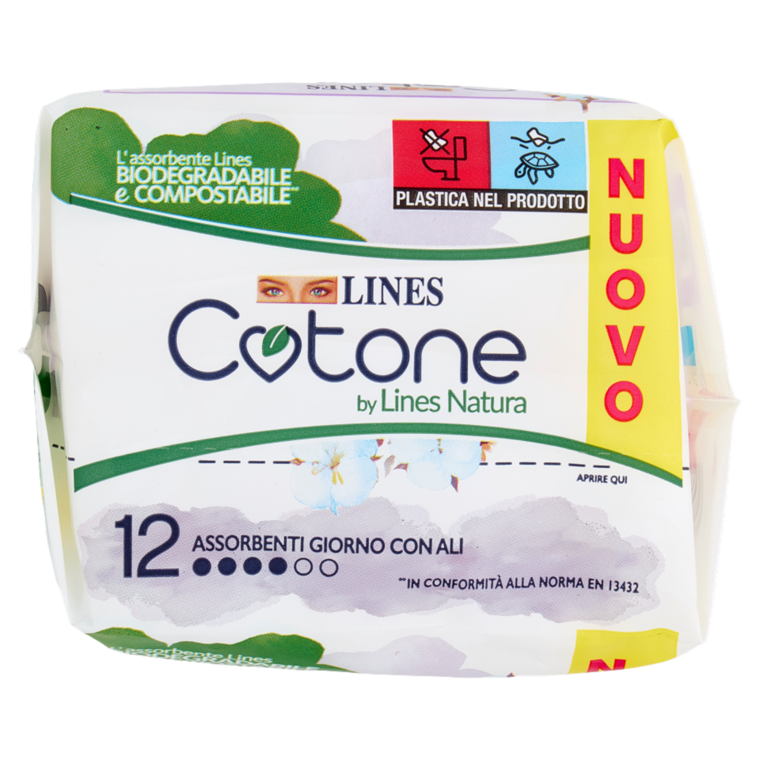 100% Cotone bio sulla pelle Filtrante in cotone per esaltare la sensazione di delicatezza sulla pelle. 100% Assorbenza Lines Cuore in cellulosa biologica certificata, per garantirti tutta l'assorbenza Lines. Novità - Biodegradabile e compostabile Grazie all'utilizzo di materie prime certificate e di origine naturale, il nuovo assorbente Lines Cotone è biodegradabile e compostabile. Prodotto biodegradabile e compostabile** con materie prime di origine naturale certificate Si disintegra** in meno di 90 giorni*** Umido /Organico Fare una raccolta differenziata fa bene all'ambiente ***Se trattato in un impianto di compostaggio **In conformità alla norma EN 13432