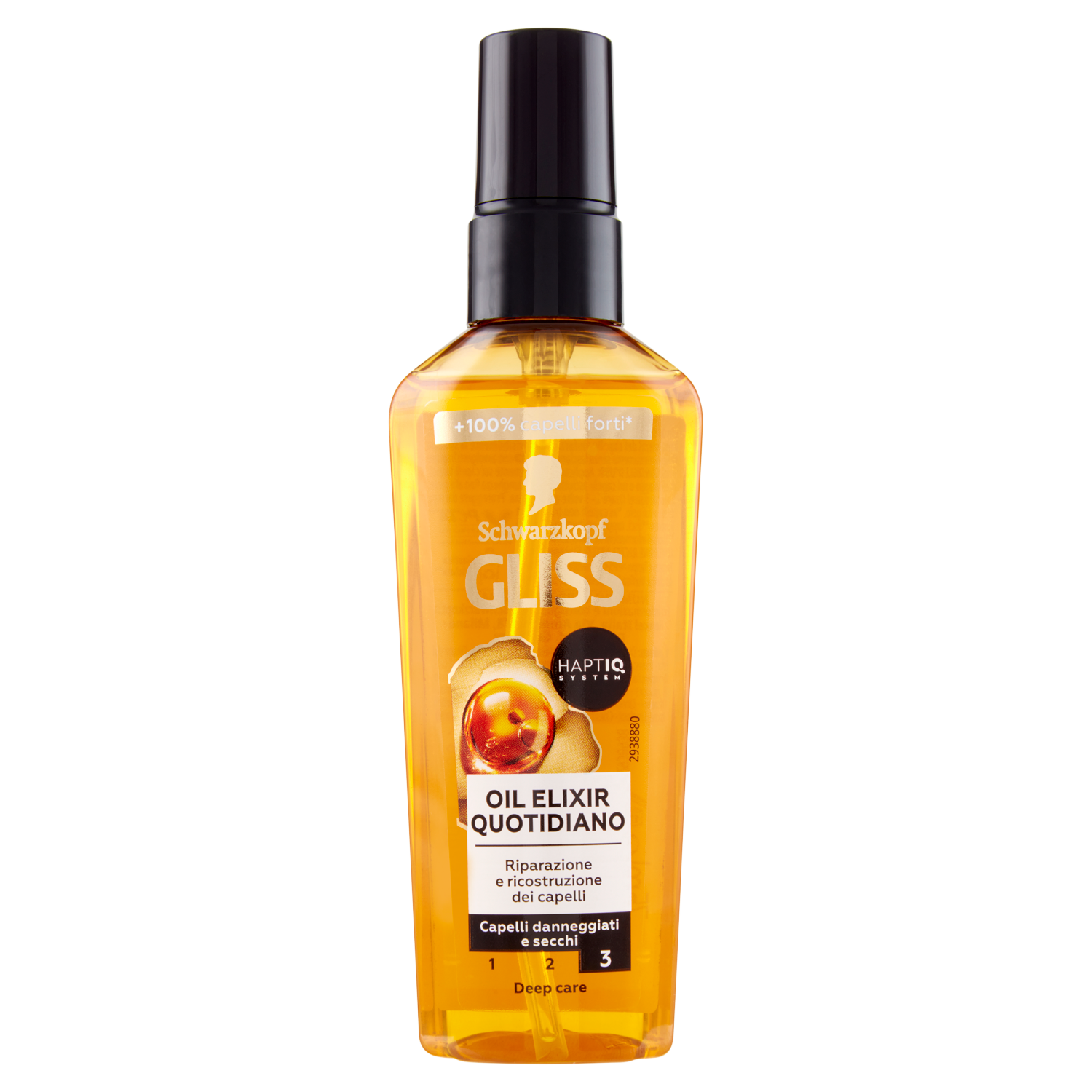 Gliss Oil Elixir Quotidiano con Haptiq System, ricrea i micro legami interni del capello rinforzandone visibilmente la struttura - Nutre intensamente senza lasciare residui - con avvolgenti fragranze floreali. 50% plastica riciclata** **escl. tappo, etichetta e coloranti