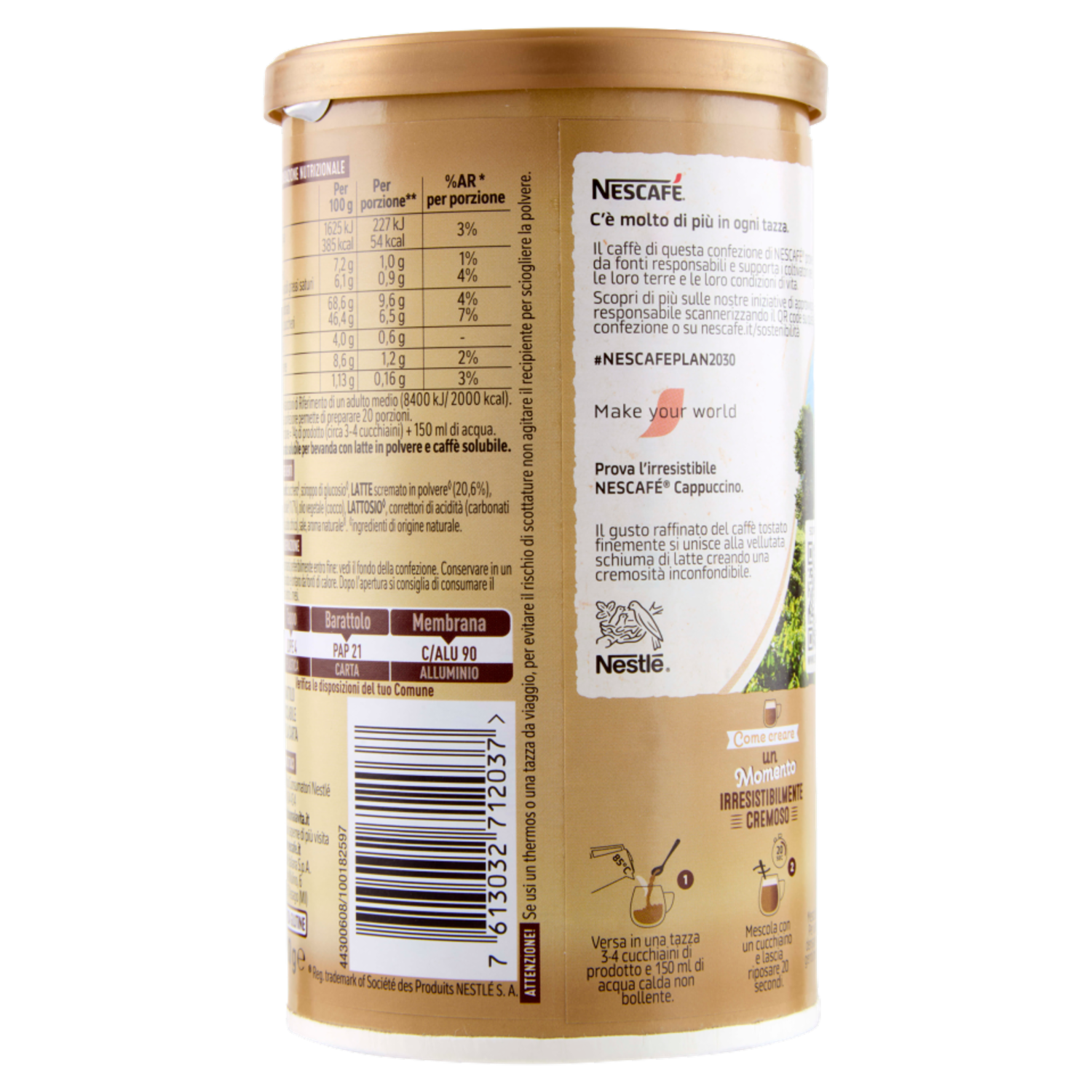 Senza glutine Il caffè di questa confezione di NESCAFÉ proviene al 100% da fonti responsabili e supporta i coltivatori nel migliorare le loro terre e le loro condizioni di vita. Scopri di più sulle nostre iniziative di approvvigionamento responsabile scannerizzando il QR code su questa confezione o su nescafe.it/sostenibilità #Nescafeplan2030 Prova l'irresistibile NESCAFÉ Cappuccino. Il gusto raffinato del caffè tostato finemente si unisce alla vellutata schiuma di latte creando una cremosità inconfondibile. - Riciclami nella carta° - 20 Tazze - °Barattolo riciclabile nella carta