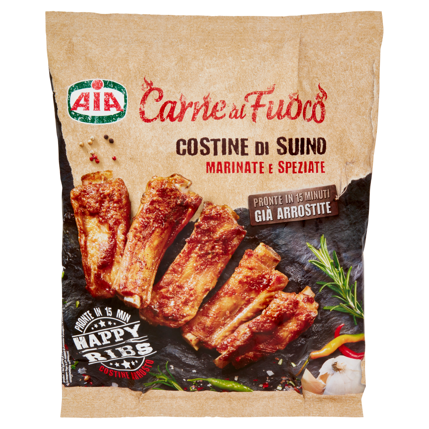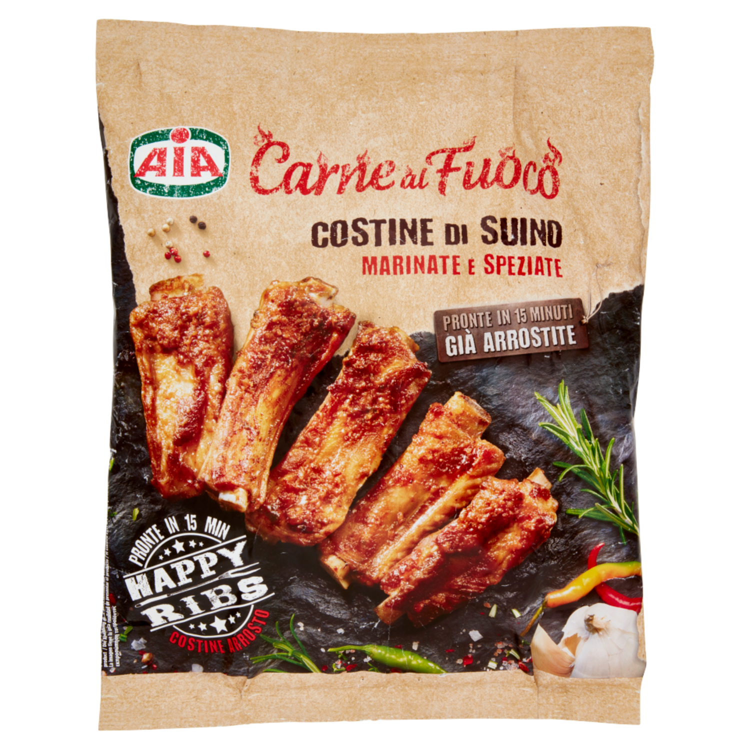 Dalla fantasia di Aia nascono le Happy Ribs, gustose costine di suino marinate arrosto. La soluzione ideale per preparare velocemente una cena fantasiosa dall'atmosfera barbecue con i tuoi amici. Provale riscaldate in forno oppure direttamente sulla griglia.