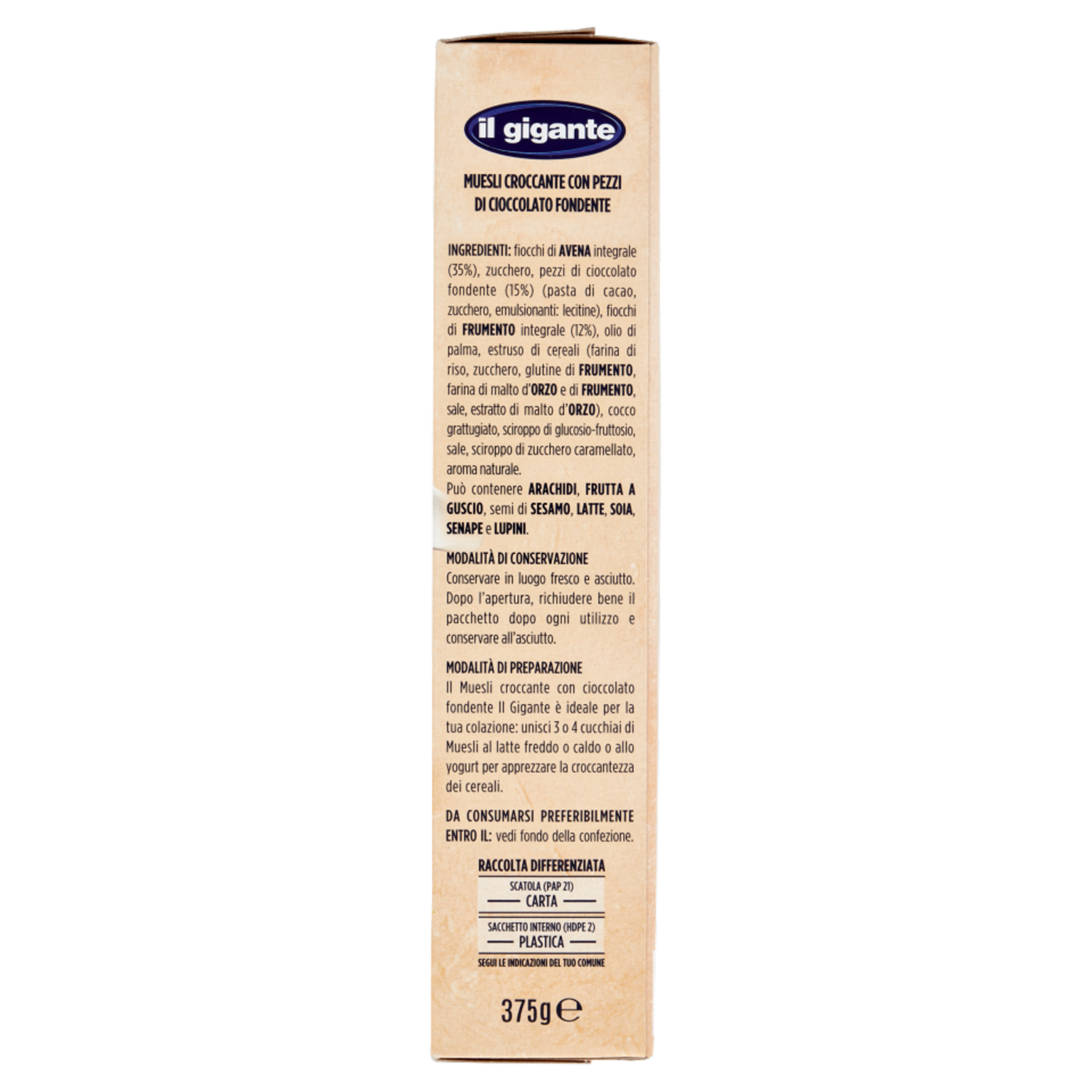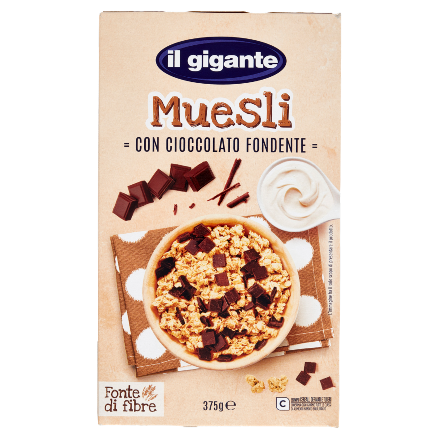 Modalità di preparazione Il Muesli croccante con cioccolato fondente Il Gigante è ideale per la tua colazione: unisci 3 o 4 cucchiai di Muesli al latte freddo o caldo o allo yogurt per apprezzare la croccantezza dei cereali.
