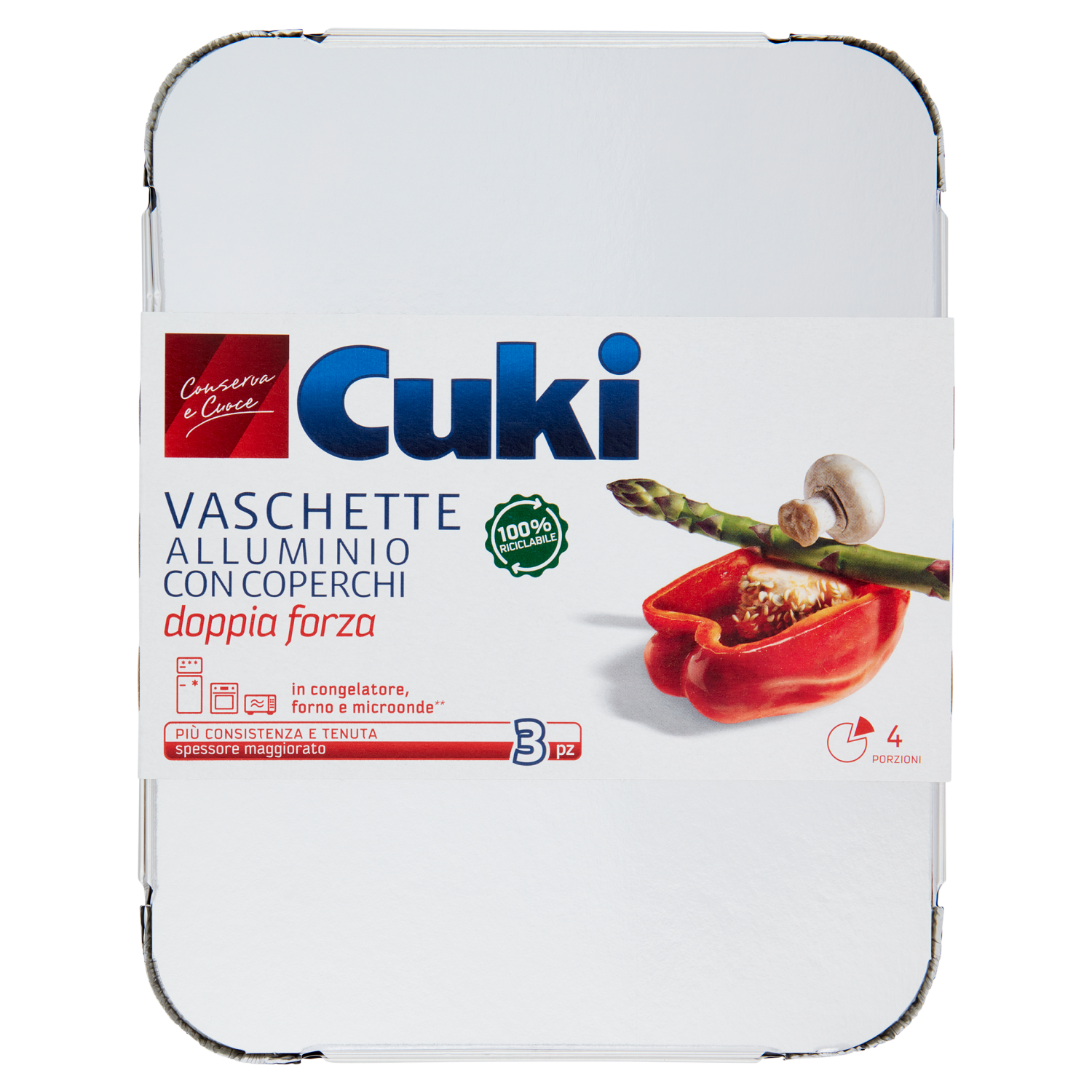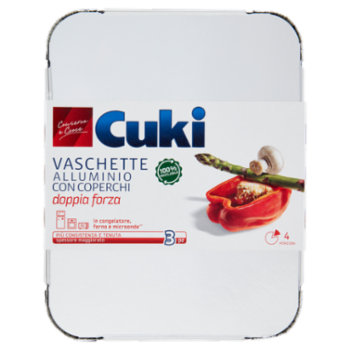 Caratteristiche Cuki Vaschette Alluminio Doppia Forza sono realizzate in alluminio a spessore maggiorato per offrirti un'elevata consistenza e tenuta. Ti permettono inoltre di ottenere una cottura ottimale, più veloce e omogenea, poiché l'alluminio è un ottimo conduttore di calore. Cuki Vaschette Alluminio con Coperchi sono provviste di apposito coperchio di chiusura e sono indicate per la cottura nel forno tradizionale e nel microonde, per la conservazione dei tuoi cibi nel frigorifero o nel congelatore, per lo scongelamento e il successivo riscaldamento, per l'asporto. Durante la congelazione Cuki Vaschette Alluminio con Coperchi proteggono i cibi dal disseccamento per disidratazione, dall'irrancidimento dei grassi per l'azione dell'aria e evitano la trasmissione degli odori tra un cibo e l'altro. I pratici coperchi, facili da utilizzare, permettono la sovrapposizione, così da sfruttare con ordine lo spazio nel congelatore.