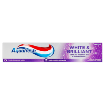 Protezione 3in1: - Rinforza lo Smalto⁺ - Aiuta a Proteggere le Gengive* - Rinfresca l'Alito Sbianca Aquafresh White & Brilliant rende i denti visibilmente** più bianchi in 7 giorni Pulisce La tecnologia con Micro-Particelle rimuove le macchie e lucida la superficie dei tuoi denti Protegge Crea uno scudo protettivo attorno al dente che aiuta a mantenere i denti più bianchi più a lungo** Sorridi con la fiducia di denti visibilmente più bianchi**. *spazzolando i denti due volte al giorno **rispetto allo spazzolamento con un normale dentifricio Aquafresh Tripla Protezione ⁺protegge lo smalto grazie al fluoruro, spazzolando i denti due volte al giorno