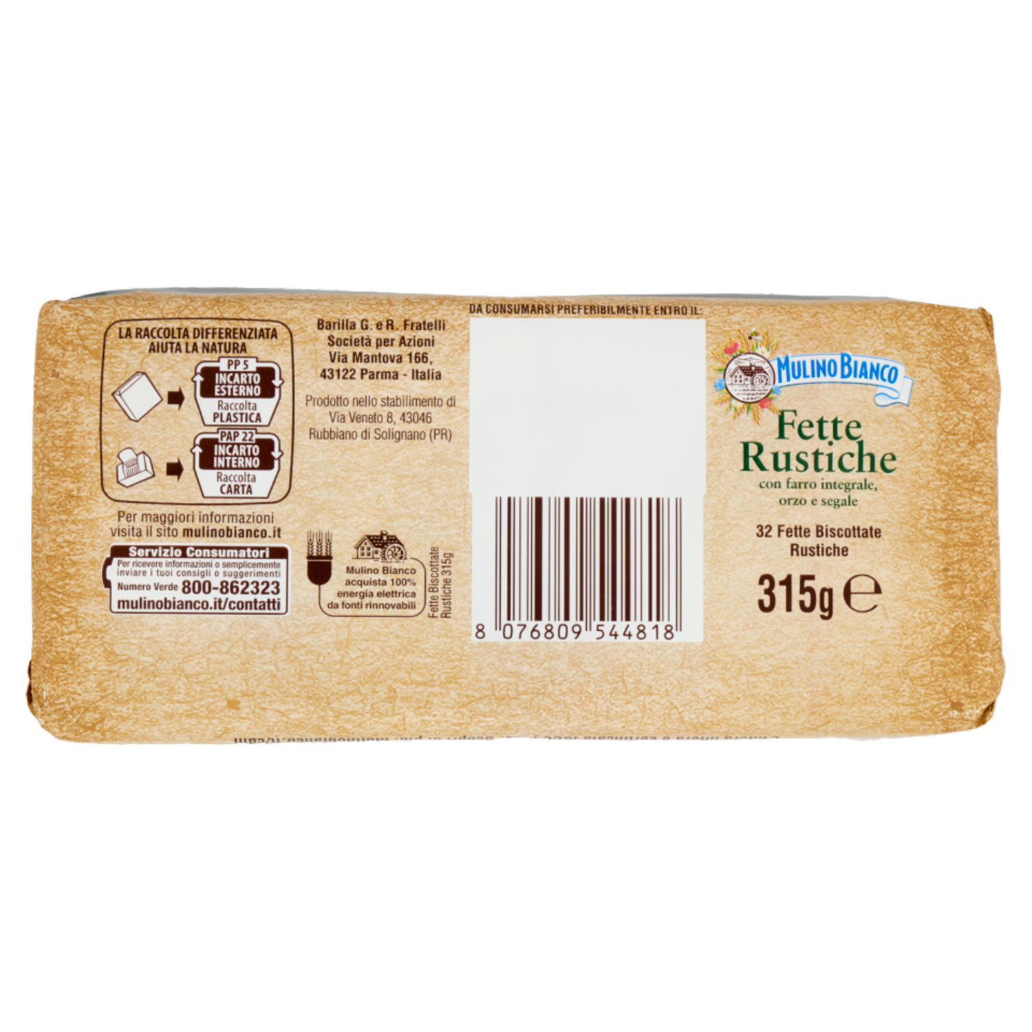 Servizio Consumatori Per ricevere informazioni o semplicemente inviare i tuoi consigli o suggerimenti Numero Verde 800-862323 mulinobianco.it/contatti Barilla G. e R. Fratelli - Società per Azioni Via Mantova, 166 43122 Parma Italia