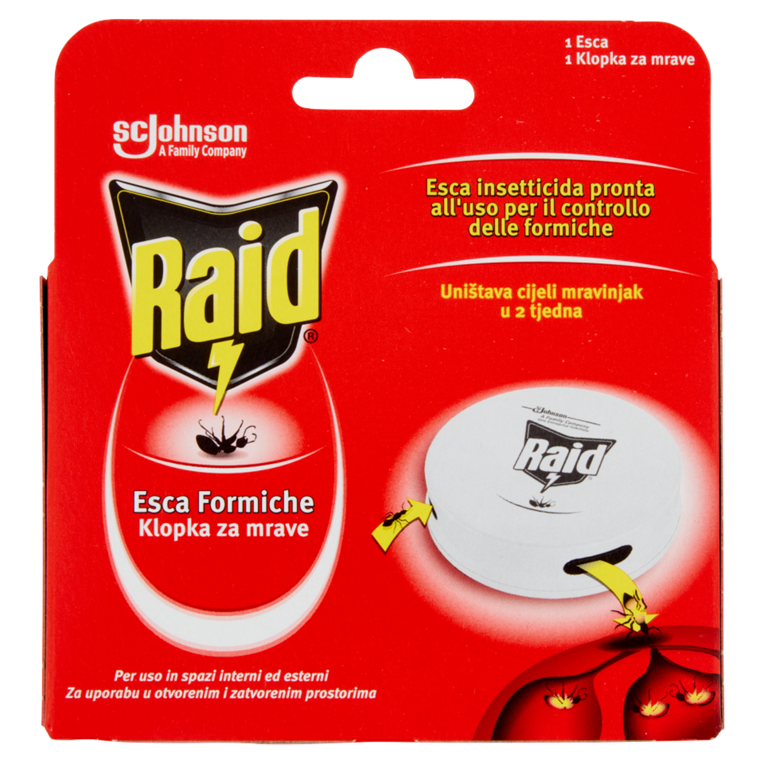 Elimina anche il formicaio. Raid Esca Formiche è un'esca pronta all'uso per il controllo delle formiche (lassius niger - adulti) indicata per la disinfestazione di case d'abitazione e aree adiacenti come balconi e terrazze, cinema, scuole, musei, ospedali, caserme, ristoranti, alberghi, campeggi, treni, navi, aerei, magazzini, industrie in genere, industrie e laboratori alimentari. L'esca contiene un supporto impregnato con soluzione insetticida.