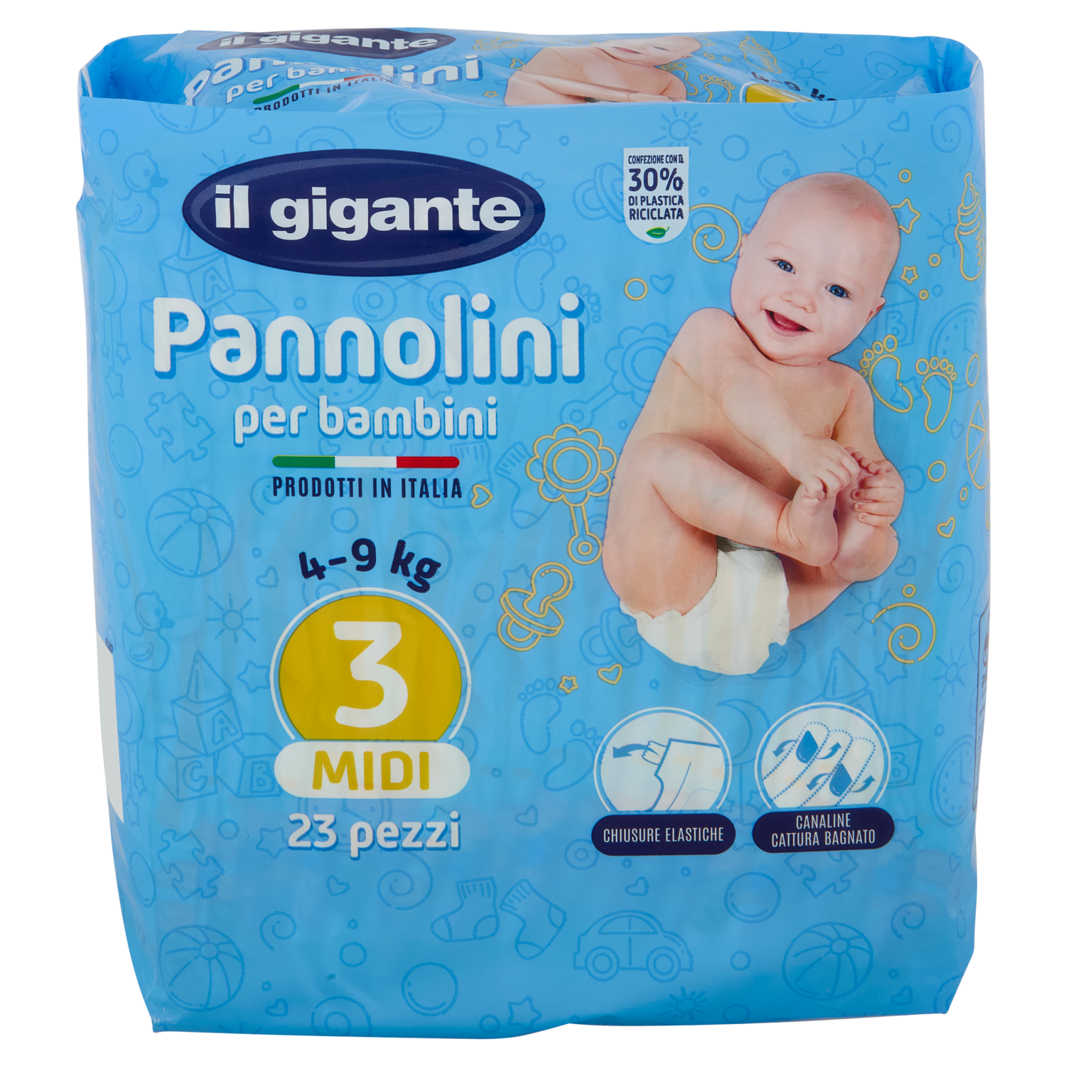 I pannolini Il Gigante sono disponibili in quattro taglie unisex 3 - 4-9kg Midi-unisex 4 - 9-18kg Maxi-unisex 5 - 11-25kg Junior-unisex 6 - 16-30kg Extralarge-unisex