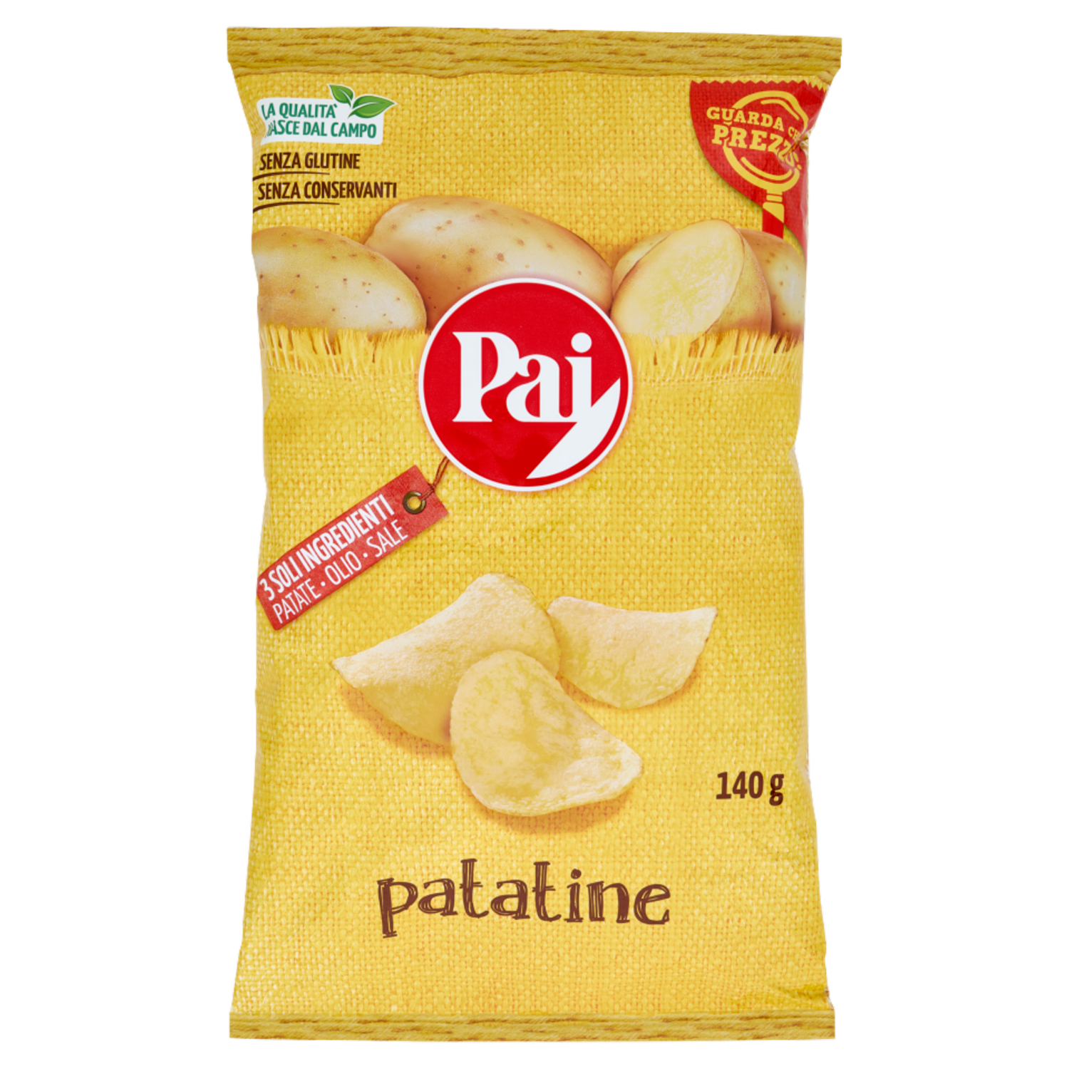 Pai La qualità nasce dal campo Nel 1959 inizia la storia di Pai, che nasce dal campo e dal rispetto per la terra. - Le patate Pai sono coltivate seguendo le pratiche agricole e gli standard che negli anni abbiamo condiviso con i nostri fornitori, al fine di garantire la massima qualità dei nostri prodotti. - Le nostre patatine sono prodotte con energia elettrica proveniente esclusivamente da fonti rinnovabili. - Tutti i nostri siti produttivi dispongono di un sistema di gestione ambientale certificato IS0 14001 e hanno tra i loro obiettivi il miglioramento continuo del proprio impegno nella tutela dell'ambiente. - Dalle bucce delle nostre patate viene prodotta energia. - 3 semplici ingredienti: patate, olio e sale. Per approfondire visita il sito www.pai.it