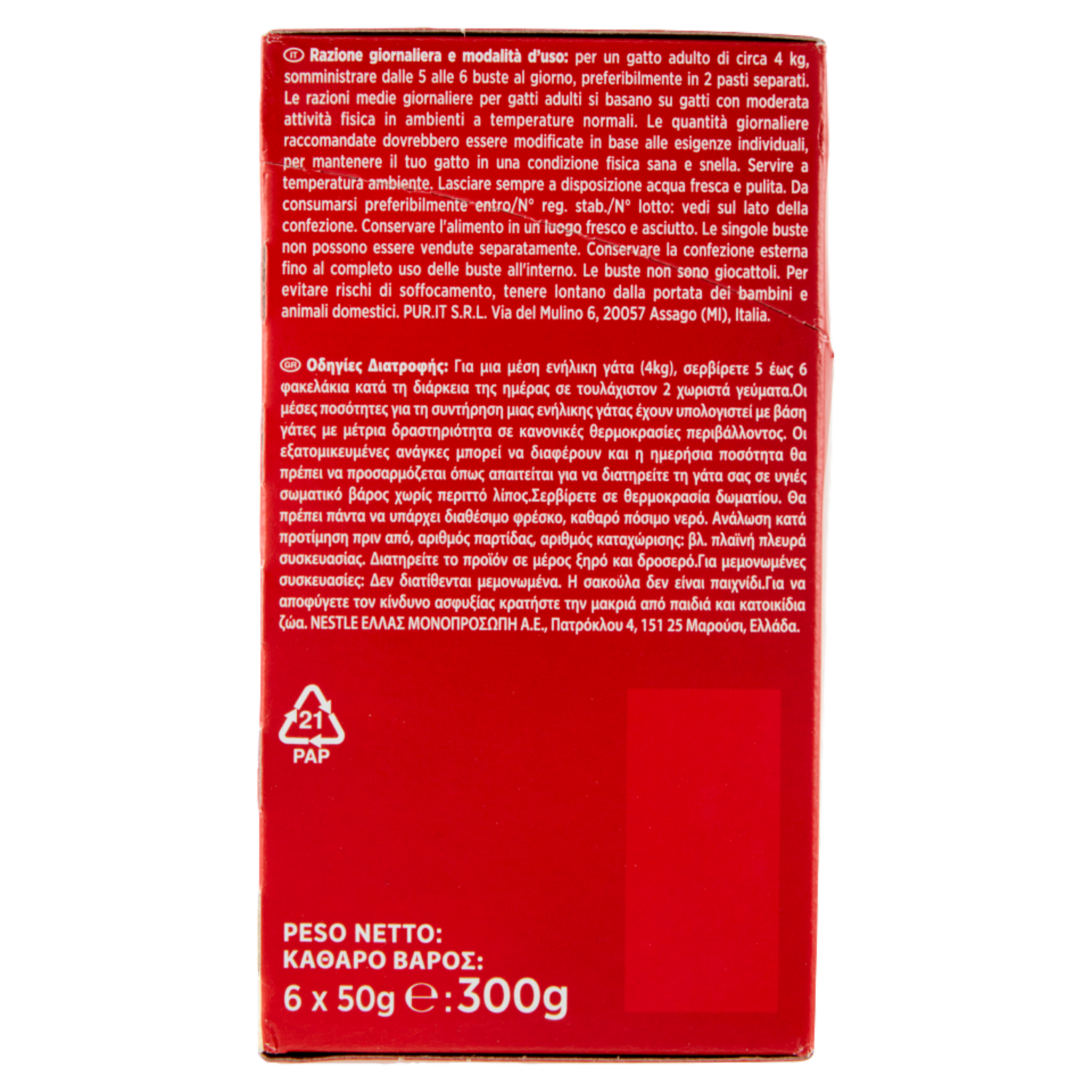Razione giornaliera e modalità d'uso: per un gatto adulto di circa 4 kg, somministrare dalle 5 alle 6 buste al giorno, preferibilmente in 2 pasti separati. Le razioni medie giornaliere per gatti adulti si basano su gatti con moderata attività fisica in ambienti a temperature normali. Le quantità giornaliere raccomandate dovrebbero essere modificate in base alle esigenze individuali, per mantenere il tuo gatto in una condizione fisica sana e snella. Servire a temperatura ambiente. Lasciare sempre a disposizione acqua fresca e pulita.