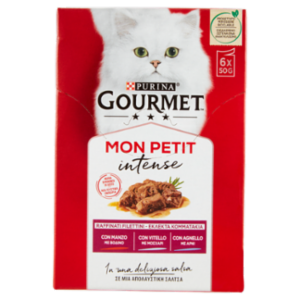 GOURMET Mon Petit Intense. Un'accurata selezione di prelibate ricette per esaltare l'essenza del gusto. Semplice da aprire, facile da servire e senza alcuno spreco, in una busta progettata per essere riciclabile. Tutte le nostre prelibate ricette sono 100% complete e bilanciate per gatti adulti. Porzioni fresche e appetitose. Preparato con ingredienti di alta qualità. Senza l'aggiunta di coloranti. Senza conservanti e aromi artificiali aggiunti. - Progettato per essere riciclabile - 6x50g - Nuova esperienza di gusto - Raffinati filettini - Con manzo - Con vitello - Con agnello - In una deliziosa salsa