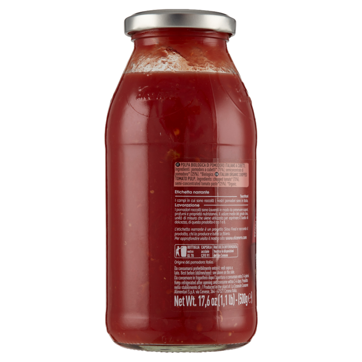 Etichetta narrante Territori I campi in cui sono raccolti i nostri pomodoro sono in Italia. Lavorazione I pomodori raccolti sono lavorati in modo da preservare sapori, profumi e proprietà nutrizionali. Il valore medio del grado brix, unità di misura che viene utilizzata per esprimere il livello di dolcezza, di questo prodotto è tra 7 e 8. L'etichetta narrante è un progetto Slow Food e racconta il prodotto, chi lo produce e tutta la filiera. Per approfondire visita il nostro sito: www.alcenero.com