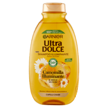 Vera ricetta di luminosità per capelli chiari, naturali o colorati, in cui Garnier Ultra Dolce associa la Camomilla conosciuta per le sue proprietà schiarenti e riflessanti, al miele noto per le sue proprietà nutritive, in una formula delicata che non appesantisce i capelli e li rende morbidi e setosi. I capelli sono brillanti e morbidi al tatto. Fine dei capelli spenti: i capelli chiari scoprono riflessi naturali e luminosi.