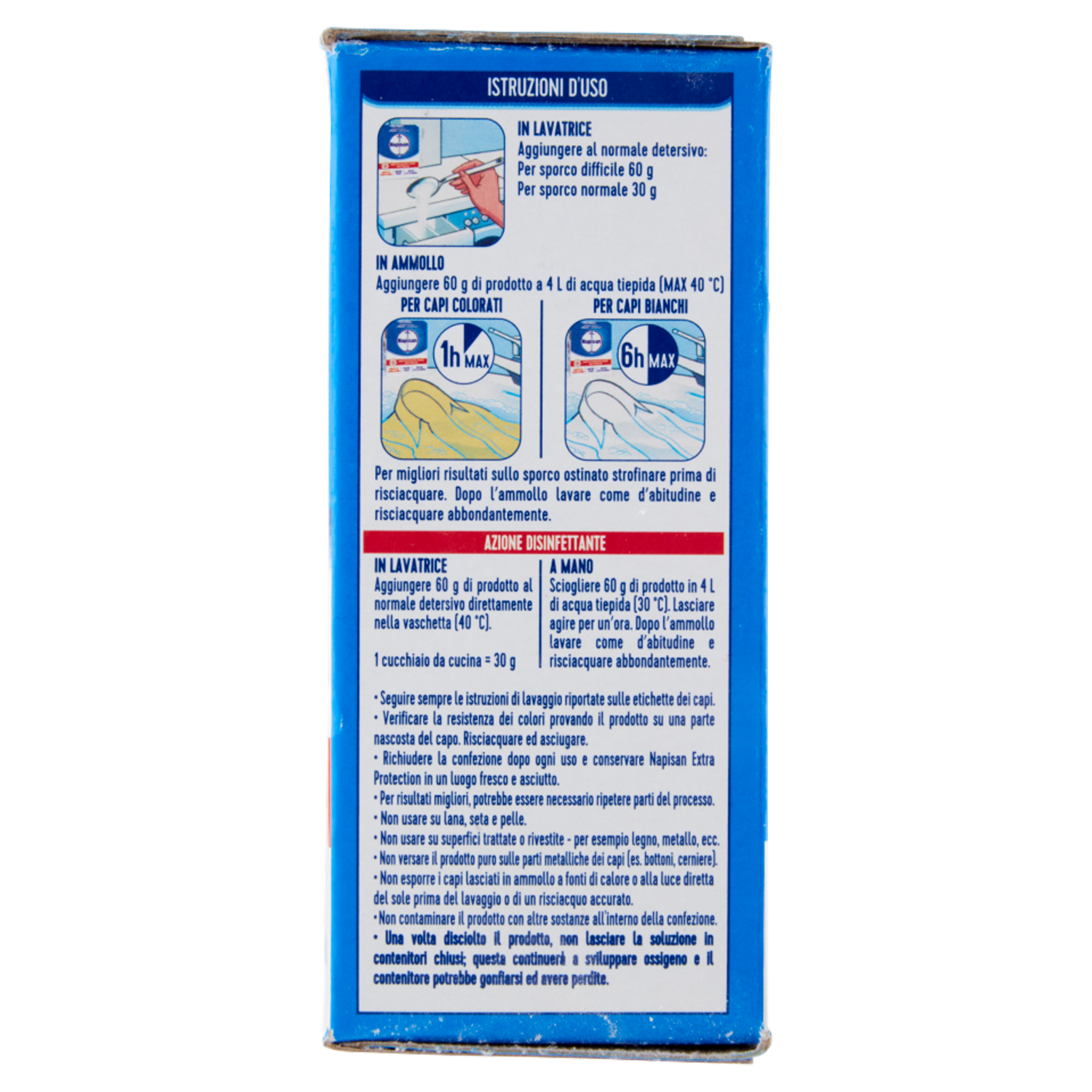 Istruzioni d'uso In lavatrice Aggiungere al normale detersivo: Per sporco difficile 60 g Per sporco normale 30 g In ammollo Aggiungere 60 g di prodotto a 4 L di acqua tiepida (Max 40 °C) Per capi colorati: 1h Max Per capi bianchi: 6h Max Per migliori risultati sullo sporco ostinato strofinare prima di risciacquare. Dopo l'ammollo lavare come d'abitudine e risciacquare abbondantemente. Azione disinfettante In lavatrice Aggiungere 60 g di prodotto al normale detersivo direttamente nella vaschetta (40 °C). 1 cucchiaio da cucina = 30 g A mano Sciogliere 60 g di prodotto in 4 L di acqua tiepida (30 °C). Lasciare agire per un'ora. Dopo l'ammollo lavare come d'abitudine e risciacquare abbondantemente. - Seguire sempre le istruzioni di lavaggio riportate sulle etichette dei capi. - Verificare la resistenza dei colori provando il prodotto su una parte nascosta del capo. Risciacquare ed asciugare. - Richiudere la confezione dopo ogni uso e conservare Napisan Extra Protection in un luogo fresco e asciutto. - Per risultati migliori, potrebbe essere necessario ripetere parti del processo. - Non usare su lana, seta e pelle. - Non usare su superfici trattate o rivestite - per esempio legno, metallo, ecc. - Non versare il prodotto puro sulle parti metalliche dei capi (es. bottoni, cerniere). - Non esporre i capi lasciati in ammollo a fonti di calore o alla luce diretta del sole prima del lavaggio o di un risciacquo accurato. - Non contaminare il prodotto con altre sostanze all'interno della confezione. - Una volta disciolto Il prodotto, non lasciare la soluzione in contenitori chiusi; questa continuerà a sviluppare ossigeno e il contenitore potrebbe gonfiarsi ed avere perdite.