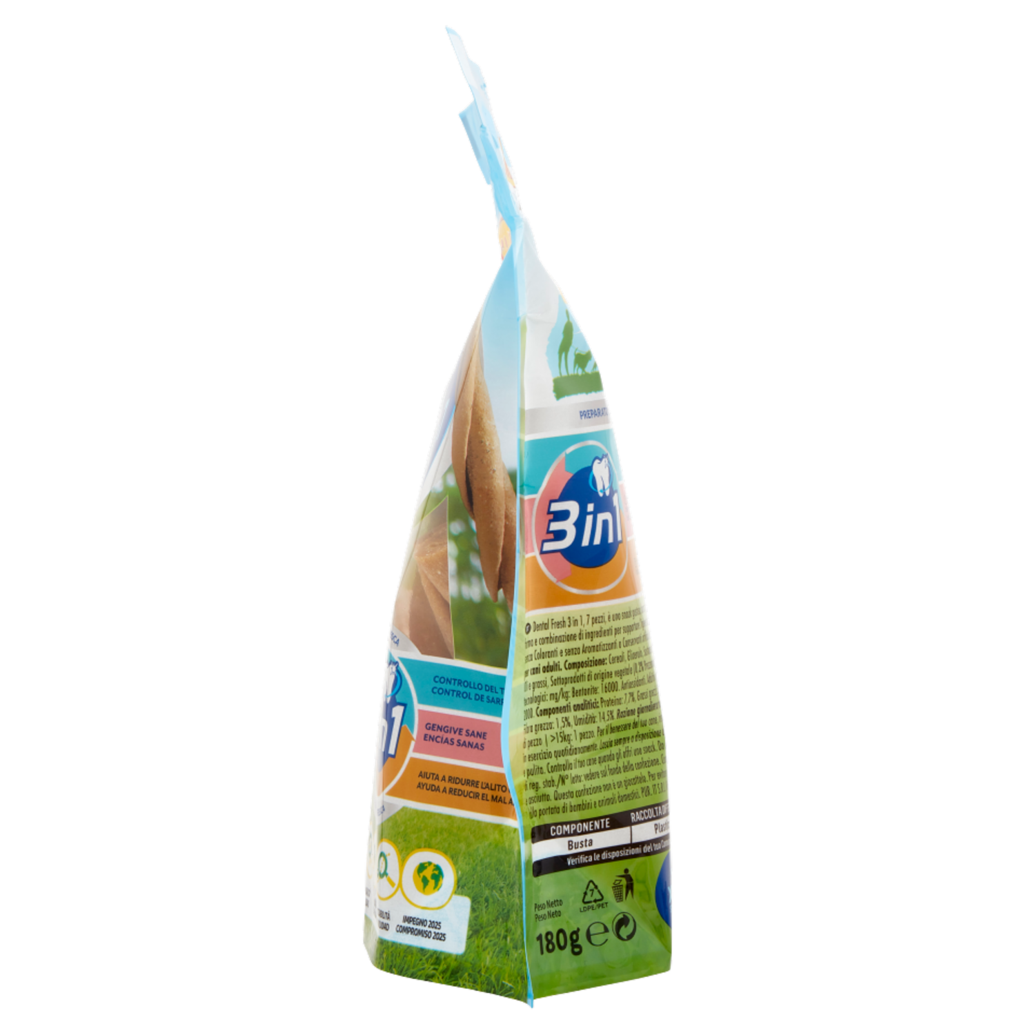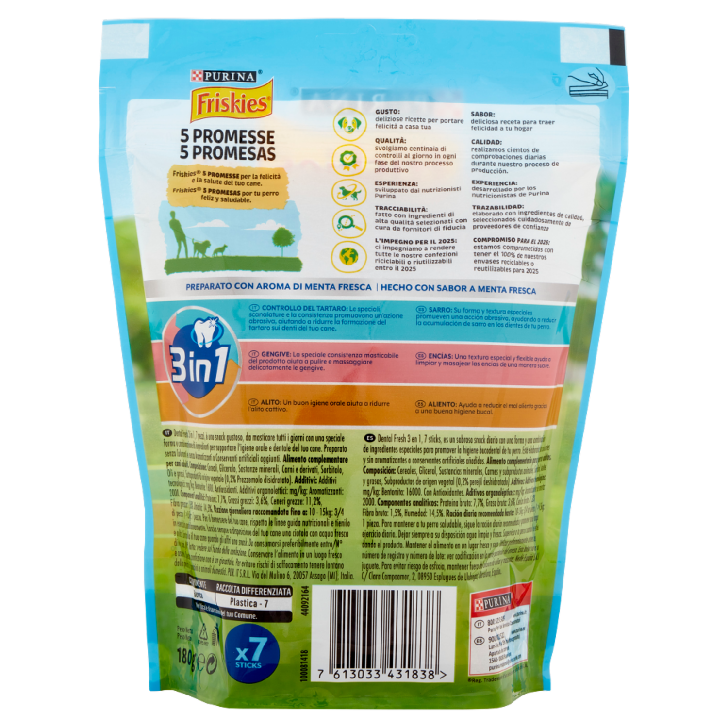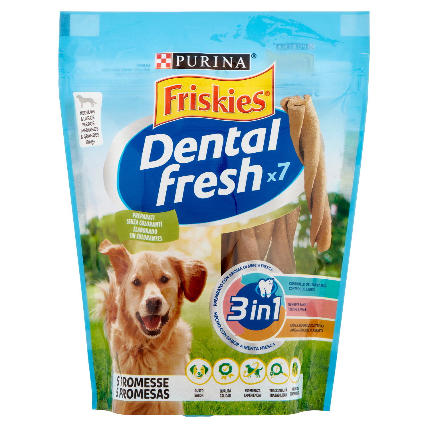 Preparato con aroma di menta fresca 3 in 1 Controllo del Tartaro: Le speciali scanalature e la consistenza promuovano un'azione abrasiva, aiutando a ridurre la formazione del tartaro sui denti del tuo cane. Gengive: La speciale consistenza masticabile del prodotto aiuta a pulire e massaggiare delicatamente le gengive. Alito: Un buon igiene orale aiuta a ridurre l'alito cattivo. Dental Fresh 3 in 1, 7 pezzi, è uno snack gustoso, da masticare tutti i giorni con una speciale forma e combinazione di ingredienti per supportare l'igiene orale e dentale del tuo cane. Preparato senza Coloranti e senza Aromatizzanti o Conservanti artificiali aggiunti. - Medium & large 10kg+ - x7 - Preparati senza coloranti - 3 In 1 preparato con aroma di menta fresca: Controllo del tartaro - Gengive sane - Aiuta a ridurre l'alito cattivo - 5 Promesse - Gusto - Qualità - Esperienza - Tracciabilità - Impegno 2025