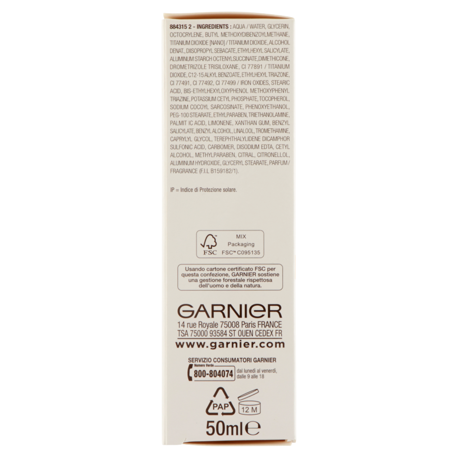 Servizio Consumatori Garnier Numero Verde 800-804074 dal lunedì al venerdì, dalle 9 alle 18 www.garnier.com