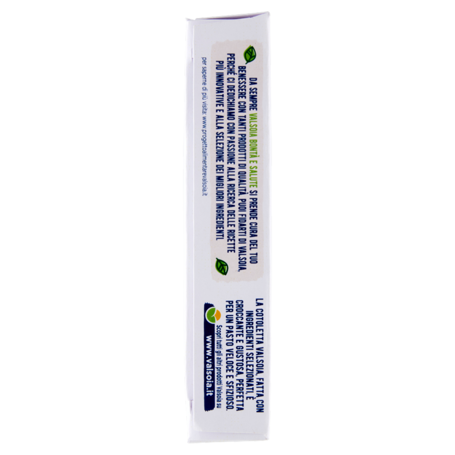 La cotoletta Valsoia, fatta con ingredienti selezionati, è croccante e gustosa, perfetta per un pasto veloce e sfizioso. Nell'ambito di una dieta varia ed equilibrata e di uno stile di vita sano, le proteine contribuiscono al mantenimento della massa muscolare. Una porzione pari a una Cotoletta (100g) contiene 16g di proteine pari al 32% della quantità giornaliera di proteine consigliata per ottenere l'effetto benefico (50g). Questa confezione contiene 2 porzioni.