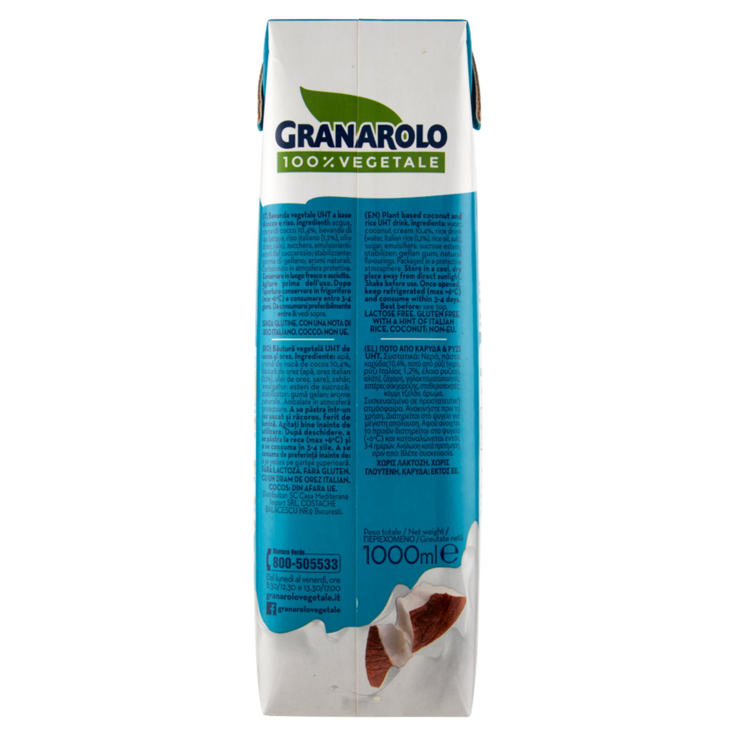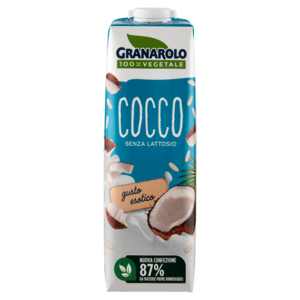 Senza glutine. Con una nota di riso italiano. Cocco: non UE. Questa confezione è composta per l'87% da materie prime rinnovabili Perché tappo e strati protettivi sono fatti con plastica proveniente dalla canna da zucchero -20% di CO2 verso la stessa confezione fatta con materiali convenzionali. Mentre cresce la canna da zucchero assorbe CO2; la produzione della plastica da canna da zucchero emette meno CO2 rispetto a quella della plastica fossile. Nuovo Tappo da canna da zucchero Gira e Versa