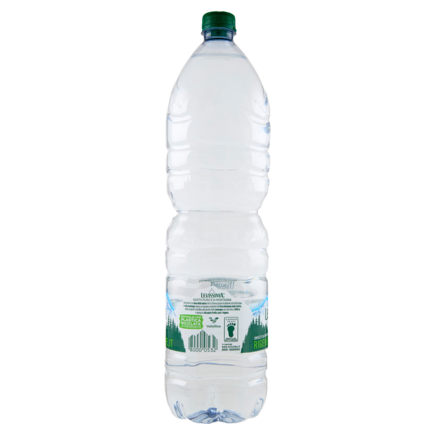 Gusto puro e di montagna Levissima è un dono della natura che si rinnova grazie al naturale ciclo dell'acqua in alta montagna. Nasce ai margini occidentali del Parco Nazionale dello Stelvio, dalle sorgenti cristalline alle pendici delle montagne con cime fino a 3000 m e sgorga in alta quota fredda, pura e leggera. Bottiglie con plastica riciclata* *45% Plastica riciclata R-PET