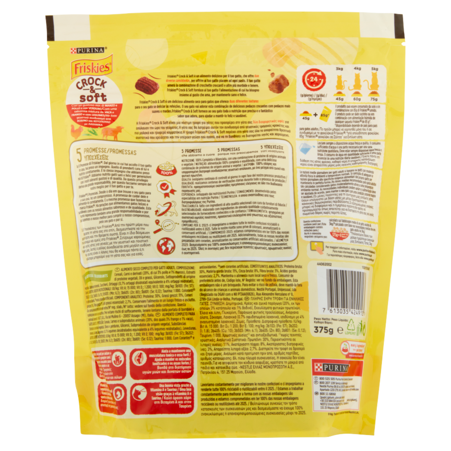 FRISKIES Crock & Soft è un alimento delizioso per il tuo gatto, che offre due diverse consistenze, per offrire al tuo gatto piacere ad ogni pasto. Il tuo gatto amerà la combinazione di crocchette croccanti e altre più morbide e tenere. FRISKIES Crock & Soft fornisce al tuo gatto l'alimentazione di cui ha bisogno insieme al gusto che ama, per mantenerlo sano e felice. - Crocchette croccanti per aiutare a mantenere denti e gengive sani - Aiuta a mantenere una muscolatura tonica e ossa forti - Vitamina E per aiutare a supportare le sue difese naturali - Una buona vista grazie a Vitamina A e Taurina - 5 Promises - 100% Complete & balanced - Quality - Traceability - Expertise - 2025 Commitment - No artificial colourants - 375g = 8 giorni