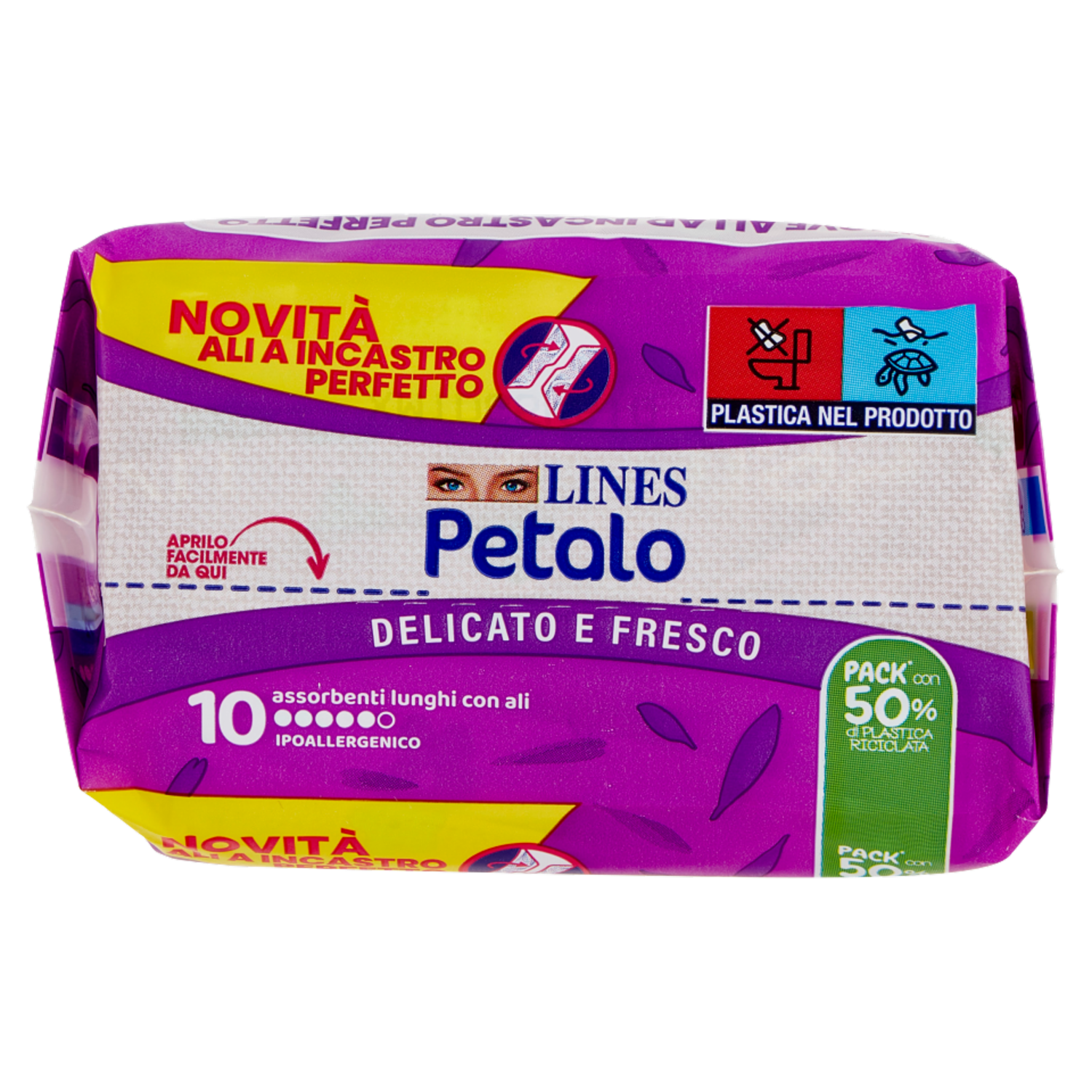 Nuove ali ad incastro perfetto Posizionate al centro per offrirti maggior comfort. Combaciano perfettamente senza sovrapporsi, così puoi rimuovere l'assorbente facilmente. Cuore Lines super assorbente Filtrante traspirante Morbido sulla pelle Comfort e aderenza Ipoallergenico Più lungo**, per flussi abbondanti. **rispetto a Petalo con ali Scopri di più sul sito www.lines.it