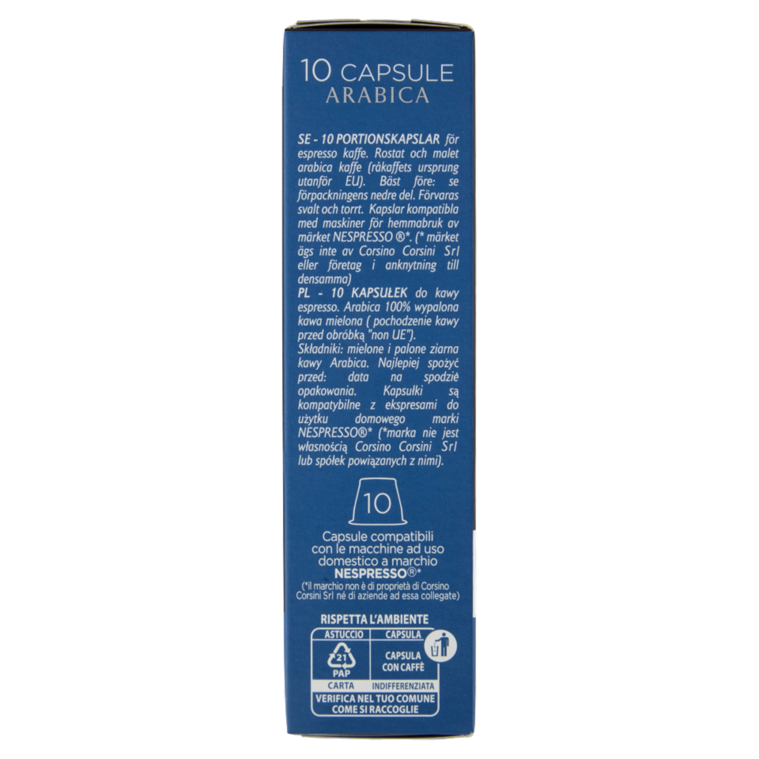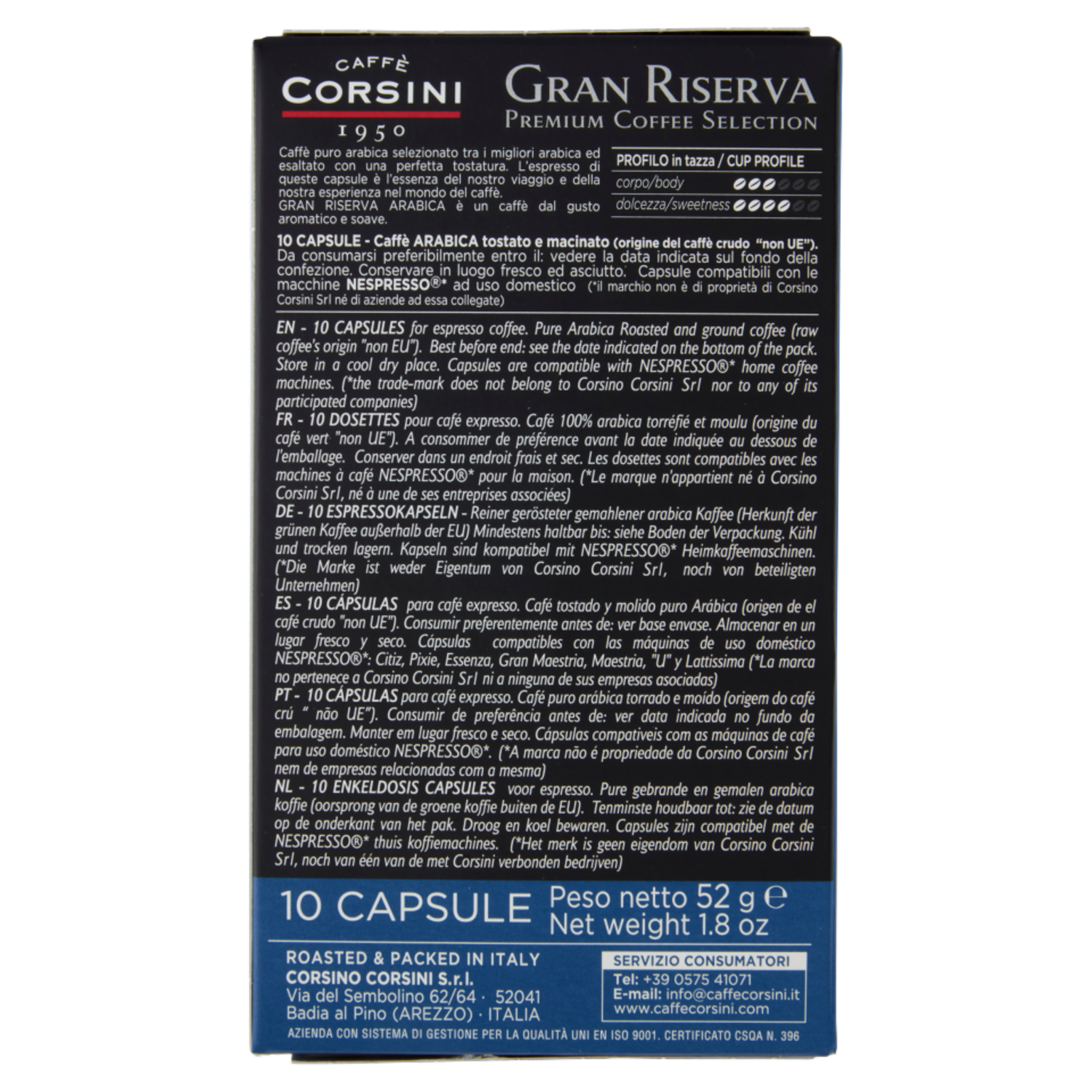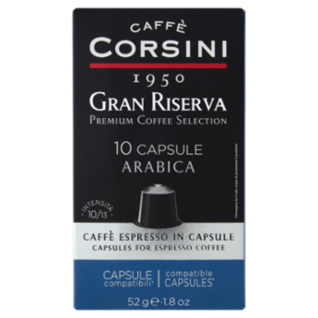 Caffè puro arabica selezionato tra i migliori arabica ed esaltato con una perfetta tostatura. L'espresso di queste capsule è l'essenza del nostro viaggio e della nostra esperienza nel mondo del caffè. Gran Riserva Arabica è un caffè dal gusto aromatico e soave. Profilo in tazza corpo 3 su 6 dolcezza 4 su 6 Capsule compatibili con le macchine Nespresso* ad uso domestico (*il marchio non è di proprietà di Corsino Corsini Srl né di aziende ad essa collegate) Tostatura: Media