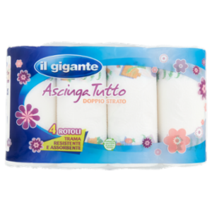 L'asciugatutto Il Gigante è prodotto in pura cellulosa vergine. Grazie alla sua particolare lavorazione, ottiene un elevato grado di resistenza e assorbenza. Ogni rotolo contiene 50 strappi.